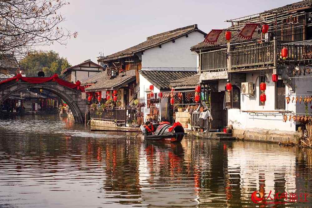 在浙江省绍兴市柯桥区安昌古镇,游客感受江南水乡的独特韵味。人民网 章勇涛摄