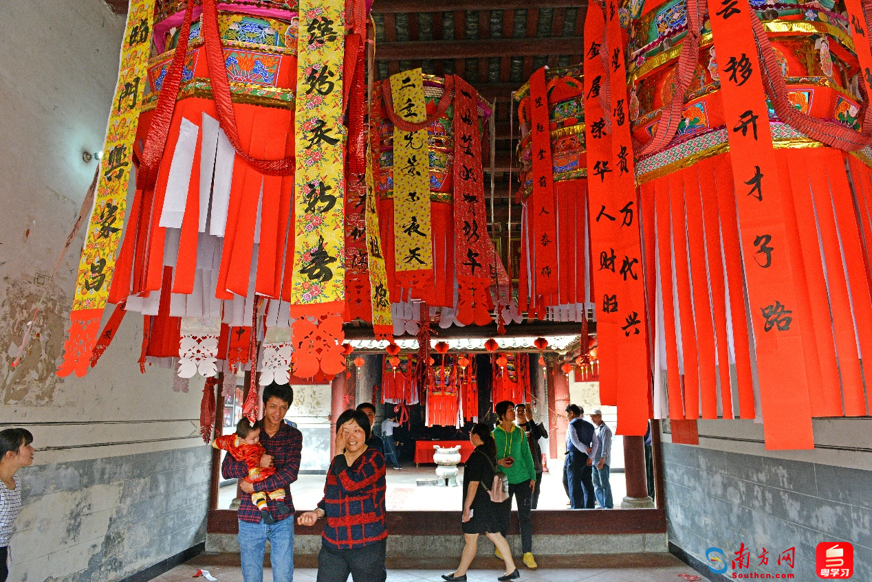 迎灯仪式一般于正月初九至十二举行,具体时间视新丁生辰八字而定,花灯需由外家送至宗祠门口,由一多子多福老翁为迎灯人,将灯迎入祠堂,交由添丁人家悬挂梁上。