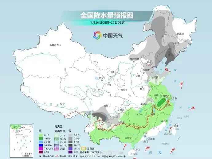受寒潮影响,预计,1月23日至27日,我国大部气温将先后下降8~12℃,西北地区东部、华北西部等地降温幅度可达14℃以上,上述地区伴有4~6级偏北风阵风7~9级;26日至27日,我国东部和南部海域有6~8级大风,阵风9~11级。28日早晨,最低气温0℃线将南压至云南北部至江南南部一带。