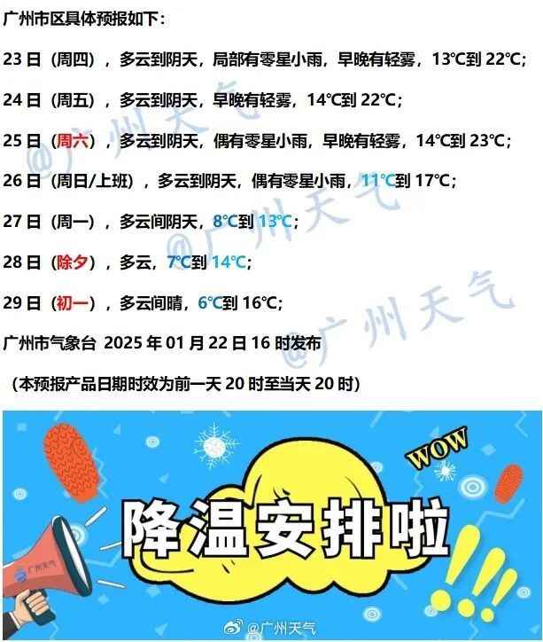 预计寒潮将于26日开始影响广东,广州的最高气温在26日至27日或创今冬以来新低。@广东天气 提醒:26-28日受强冷空气影响,广东大部市县小雨或分散小雨转多云,粤北高海拔山区有小雪或雨夹雪,气温自北向南下降6~10℃,天气转冷,注意防寒保暖。