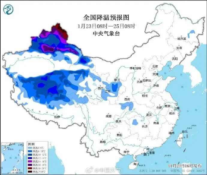 预计,1月23日08时至25日08时,新疆北部、西藏北部、青海西部甘肃西部和东北部、宁夏南部等地将先后降温8~10℃,其中,新疆北部、西藏北部等地部分地区降温可达12℃以上。新疆北部、西北地区东部等地有5~7级风、阵风7~9级,西藏大部、青海中南部、川西高原等地有5~7级风、阵风8~10级。