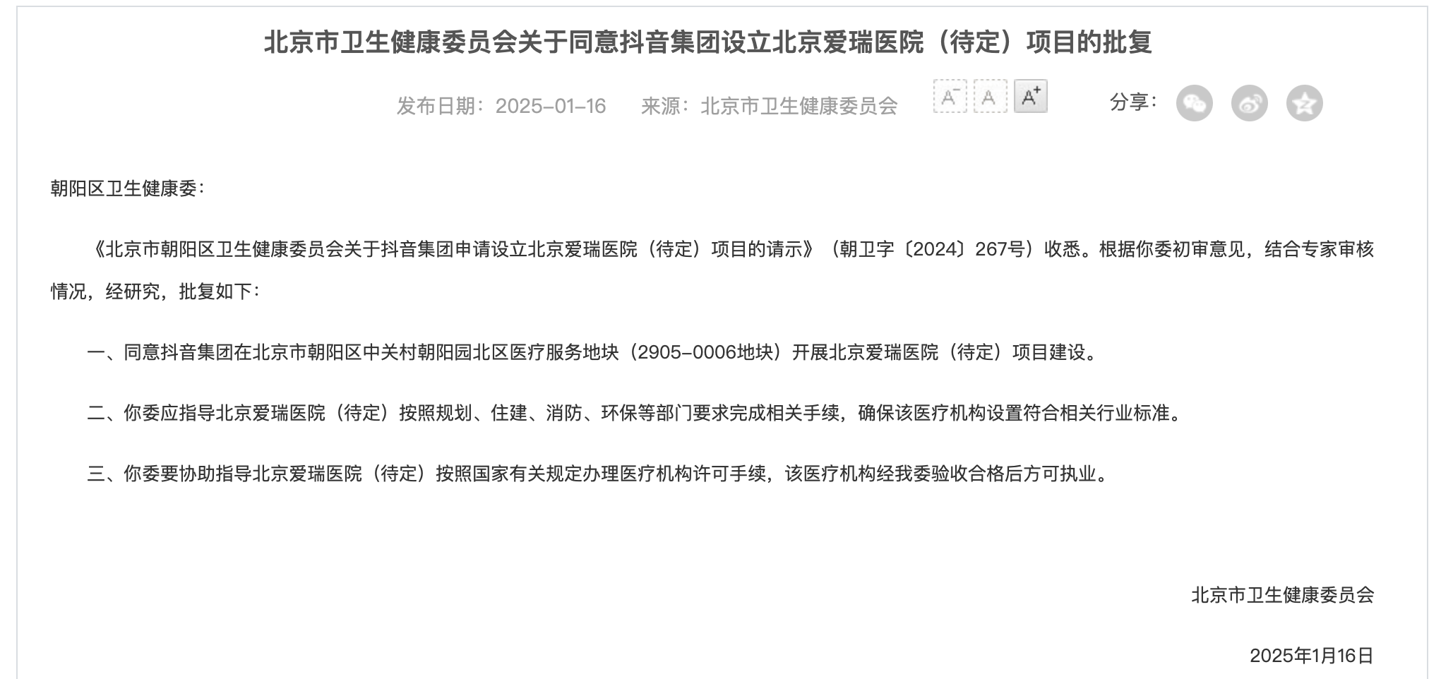 近日,北京市卫健委官网显示,《北京市朝阳区卫生健康委员会关于抖音集团申请设立北京爱瑞医院(待定)项目的请示》已得到批复,批复内容为: