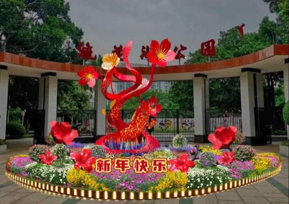 流花湖公园在春节期间以“流花之声,花响新春”为主题进行花景布展,分别在公园南门、北门以及蒲林广场进行摆花和景观架构的搭建,造景面积超1000㎡。