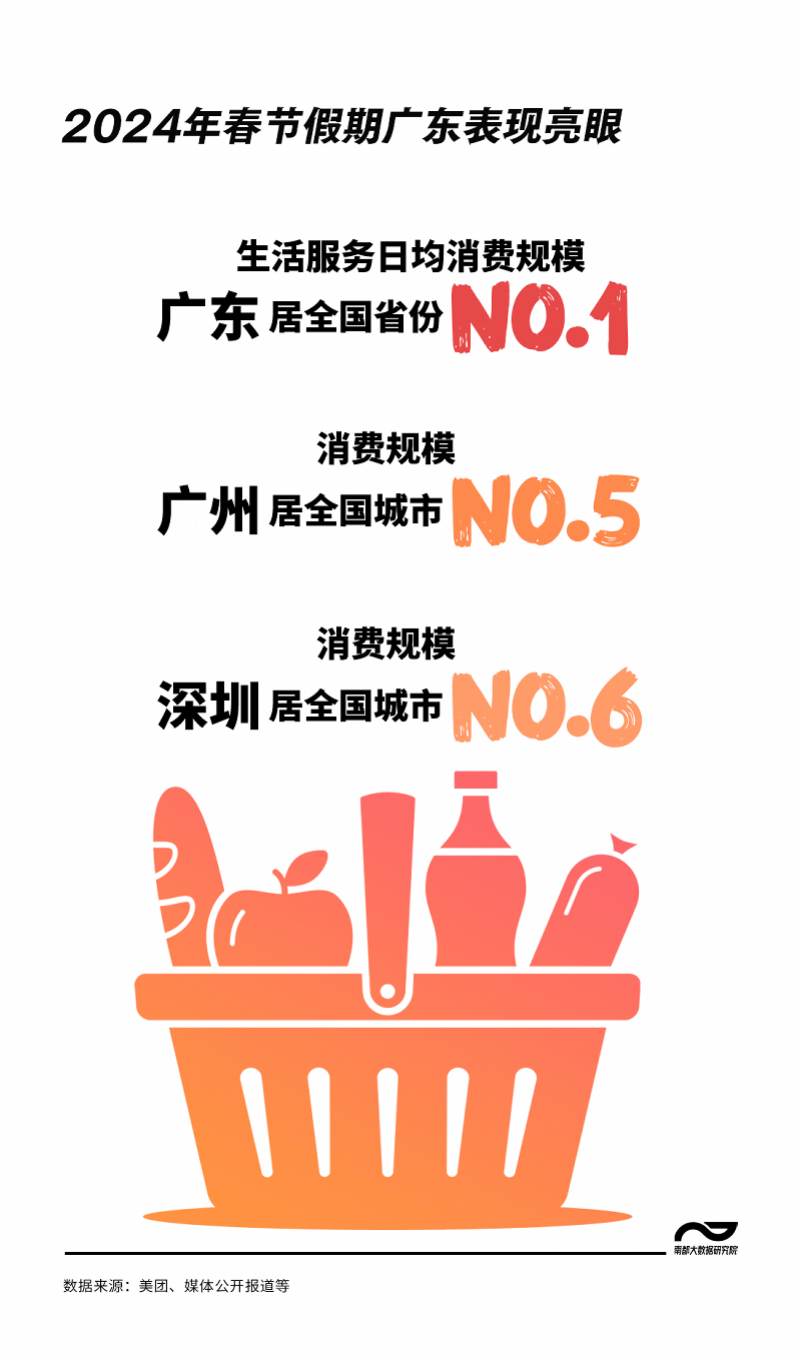 在营造不一样团圆氛围的同时,反向春运也撬动了广东服务业、旅游业的发展,有效刺激了消费。2024年春节假期,广东省共接待游客7606.9万人次,意味着全国国内旅游出游的4.74亿人次中,有16%来了广东。美团发布的2024春节“吃喝玩乐”消费数据显示,广东省春节假期日均消费规模位居全国省份第一,广州消费规模居全国城市第五,深圳消费规模居全国城市第六。
