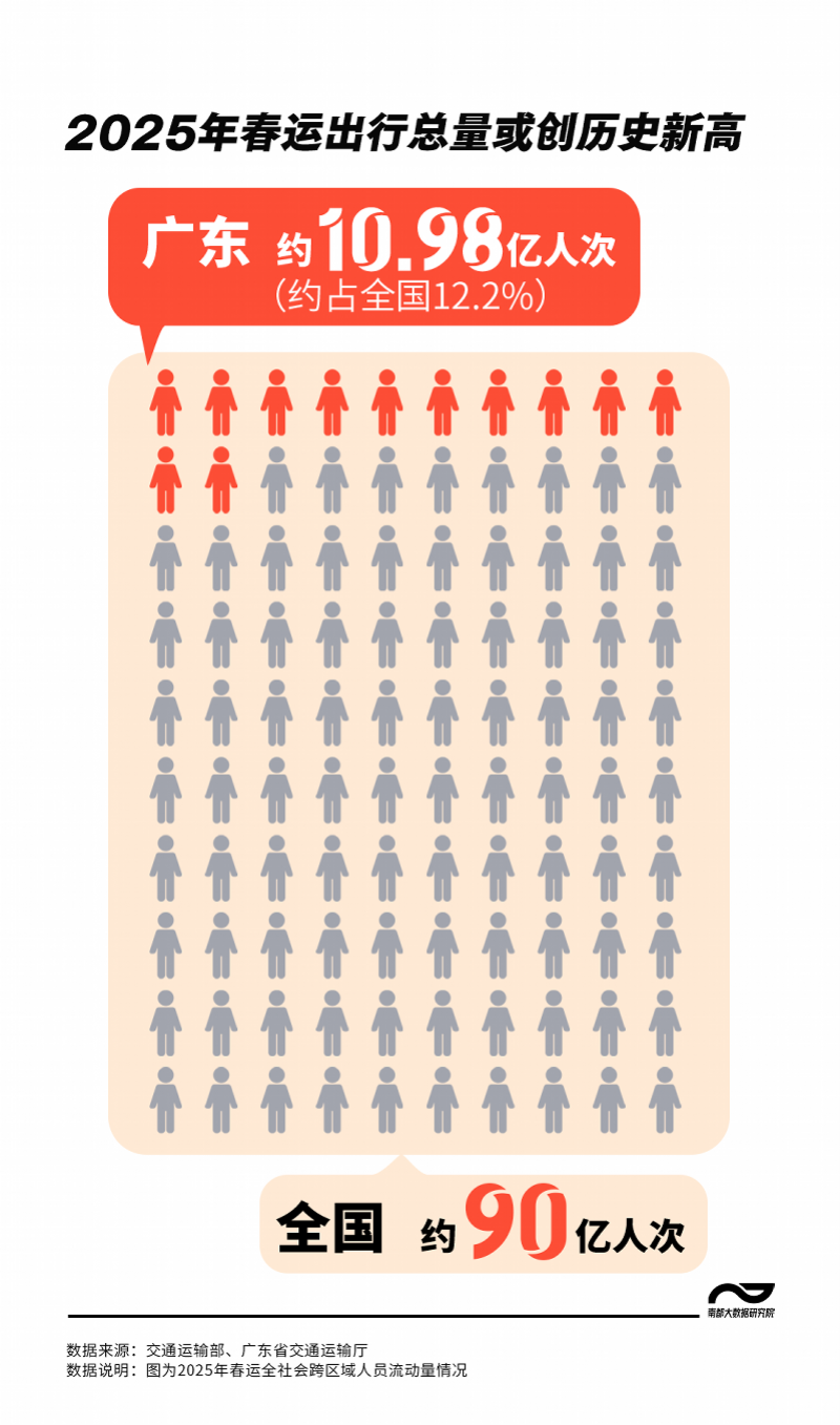 作为人类历史上规模最大的、周期性的人类大迁徙,春运甚至入选了世界纪录协会世界上最大的周期性运输高峰。今年春运有多少人出行?据交通运输等部门预计,2025年春运全社会跨区域人员流动将达到90亿人次,铁路、民航客运量有望分别突破5.1亿人次和9000万人次,均创历史新高。具体到广东省,初步预计2025年春运广东省全社会跨区域出行人员流动量约10.98亿人次,约占全国12.2%,同比增长4%。预计春运期间广东省跨区域人员流动量、铁路客运量、民航客运量有望创新高。