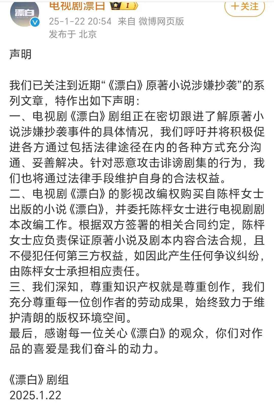 该剧组在声明中表示,该剧的影视改编权购买自陈枰出版的小说《漂白》,并委托陈枰进行电视剧剧本改编工作。根据双方签署的相关合同约定,陈枰应负责保证原著小说及剧本内容合法合规,且不侵犯任何第三方权益,如因此产生任何争议纠纷,由陈枰承担相应责任。