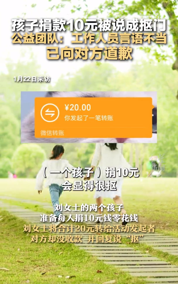1月22日,一位母亲反映自家俩孩子拿零花钱各捐10元做公益却被公益组织嫌“抠”拒收,投诉后又被公益组织除名,引发关注。