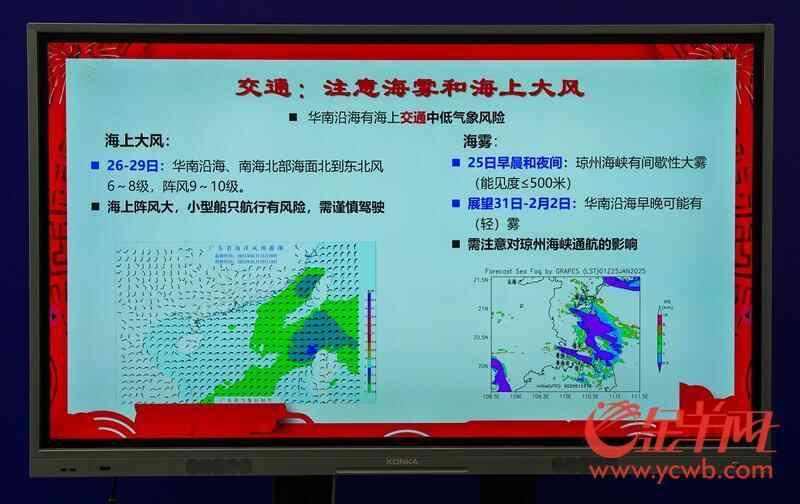 除了冷空气,杨国杰表示广东还需要关注大雾天气影响。预计24日夜间至26日凌晨,琼州海峡有间歇性大雾天气,能见度低于500米的时段将出现在25日早晨和26日凌晨,单次持续时间约8小时,最低能见度100米左右,预计白天能见度将逐渐回升到1公里以上;