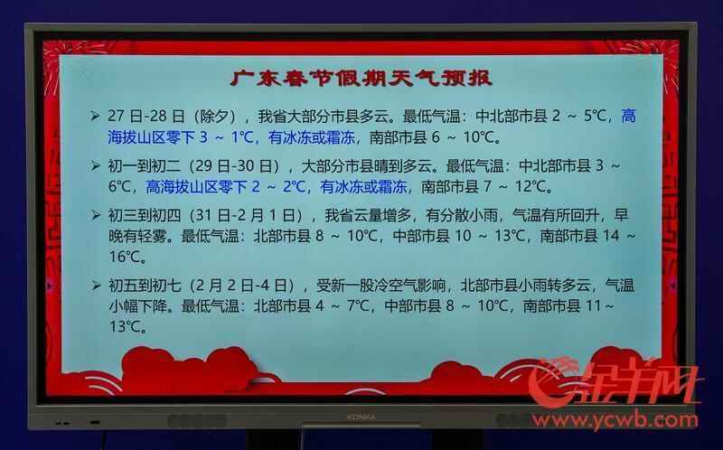 广东省气象台首席预报员杨国杰介绍,预计26至28日(腊月廿七至除夕),广东各地气温累计下降6~10℃,粤北高海拔山区有雨夹雪或小雪,过程最低气温出现在27日至28日(腊月廿八至除夕)早晨,届时广东中北部市县2~5℃,高海拔山区-3~1℃,有冰冻或霜冻,广东南部市县6~10℃,广州市区最低6℃。