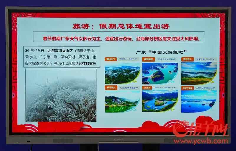 杨国杰介绍,虽然强冷空气可能会带来低温寒冷风险,但一定程度上也丰富了广东的旅游资源。预计26日至29日(腊月廿七至正月初一),粤北高海拔山区将出现冰挂雾凇景观,广东本地居民和外地访粤游客,做好防护措施可赏难得的“南国冰景”。