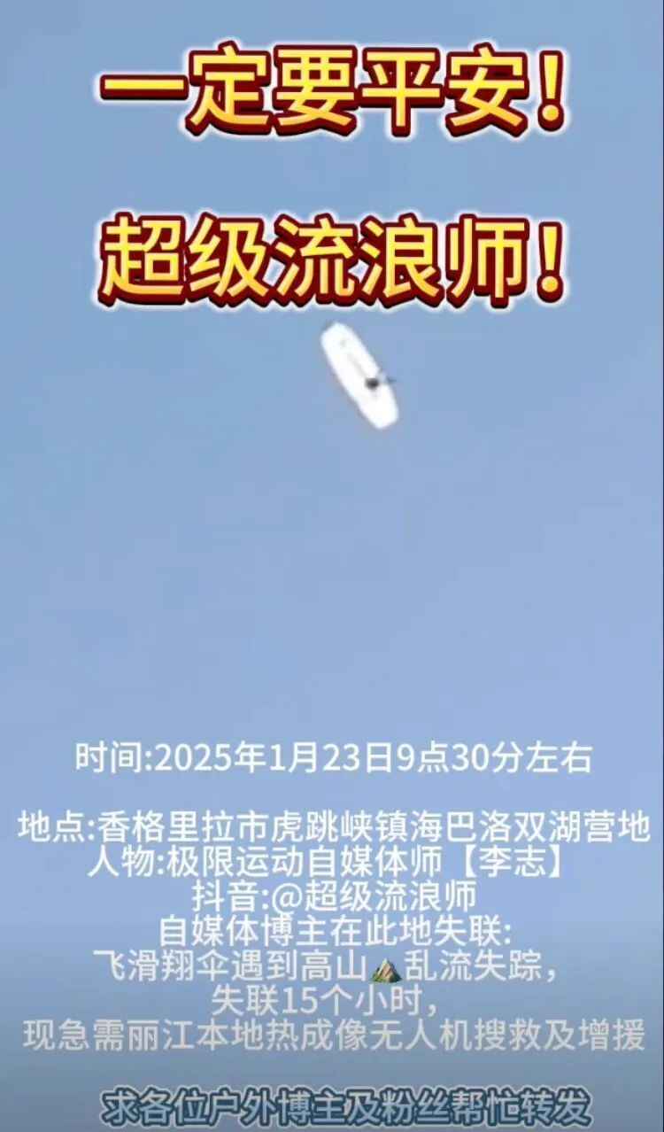 1月24日凌晨,网友“金鱼快跑”发布求助信息称,1月23日上午9时30分左右,其男友、极限运动自媒体博主李志(抖音:超级流浪师)在云南香格里拉市虎跳峡镇海巴洛双湖营地飞滑翔伞时遇到高山乱流失踪,急需热成像无人机搜救及增援。