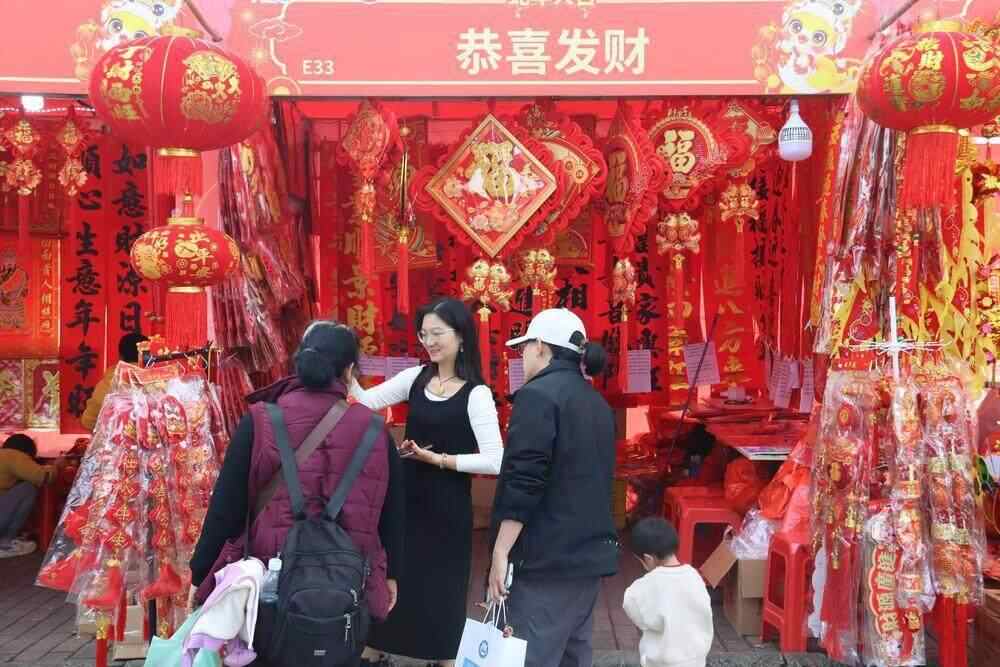 在年货区,传统春联、大红灯笼、利是封、风车等应有尽有,各地的特色产品、干果蜜饯等也汇聚于此,带着对新春的期许,络绎不绝的市民前来挑选心仪的年货。