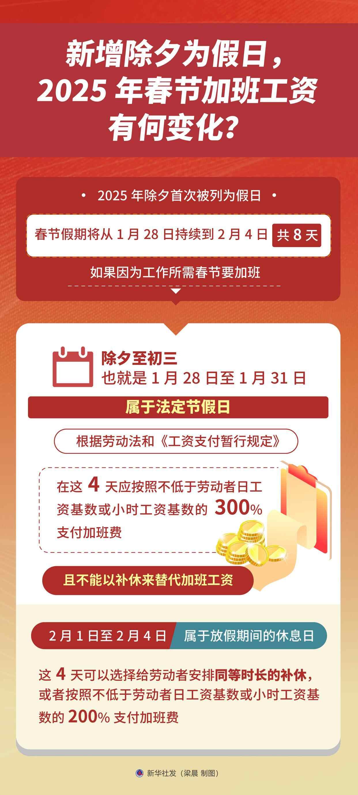 2025年除夕首次被列为假日,春节假期将从1月28日持续到2月4日,共8天。如果因为工作所需春节要加班,后续安排补休就可以了吗?除夕上班应该算几倍工资?上海、北京等多地人社部门近日发文予以解答。
