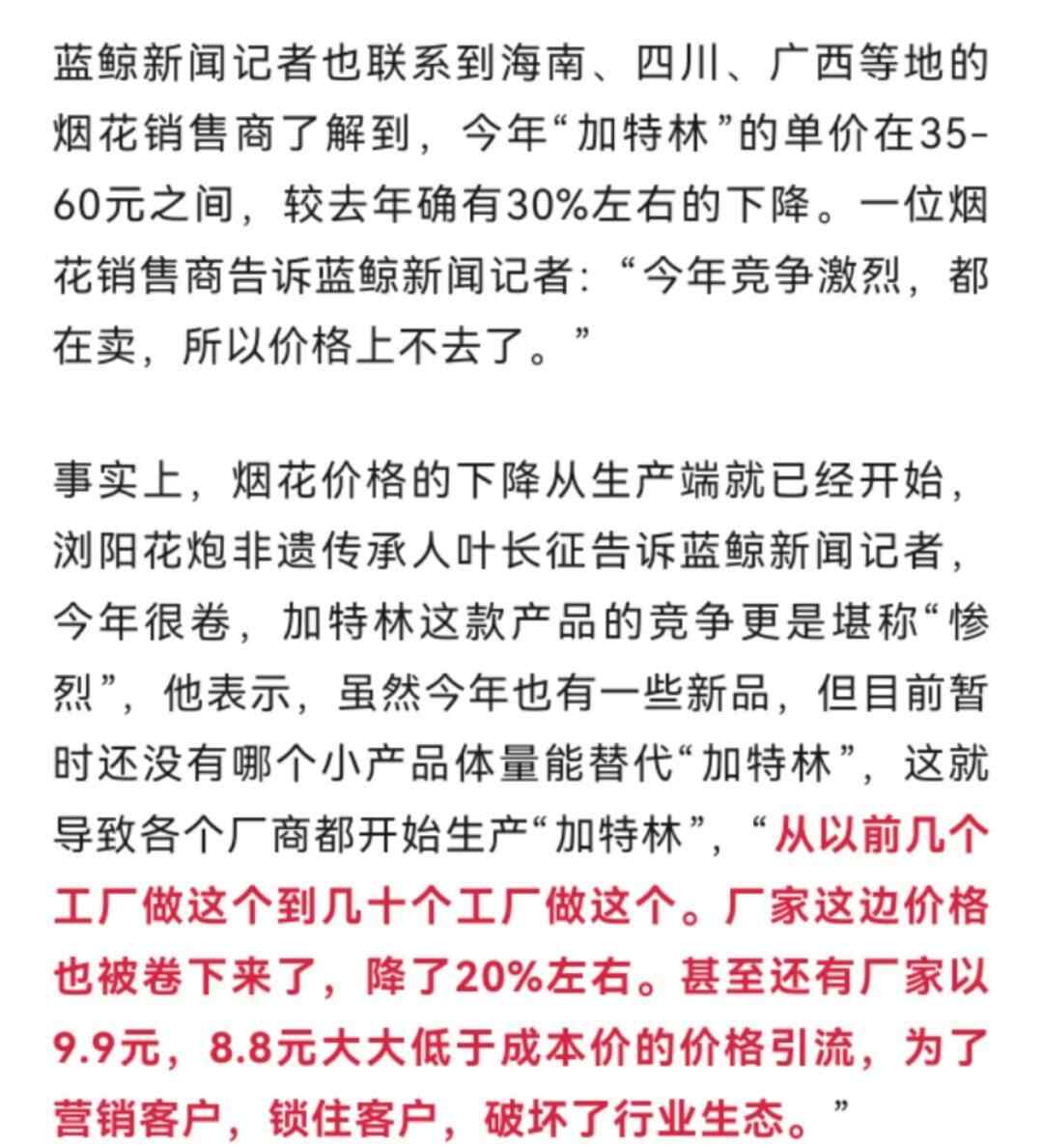 2023年春节期间,据每日经济新闻报道,“加特林”价格曾涨了十倍,从原来的20元一支已上涨到60元,到了外地某些城市甚至能卖到200元一支。一家面临倒闭的烟花厂家,甚至曾因为卖“加特林”直接活了过来。