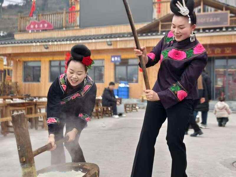 1月23日,贵州黔东南。“村BA”欢乐购大集上,苗家阿妹打糍粑。刘胤衡/摄