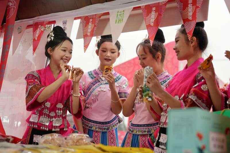 1月22日,贵州黔东南。“村BA”欢乐购大集上,游客品尝特色小吃。中国航空工业集团供图