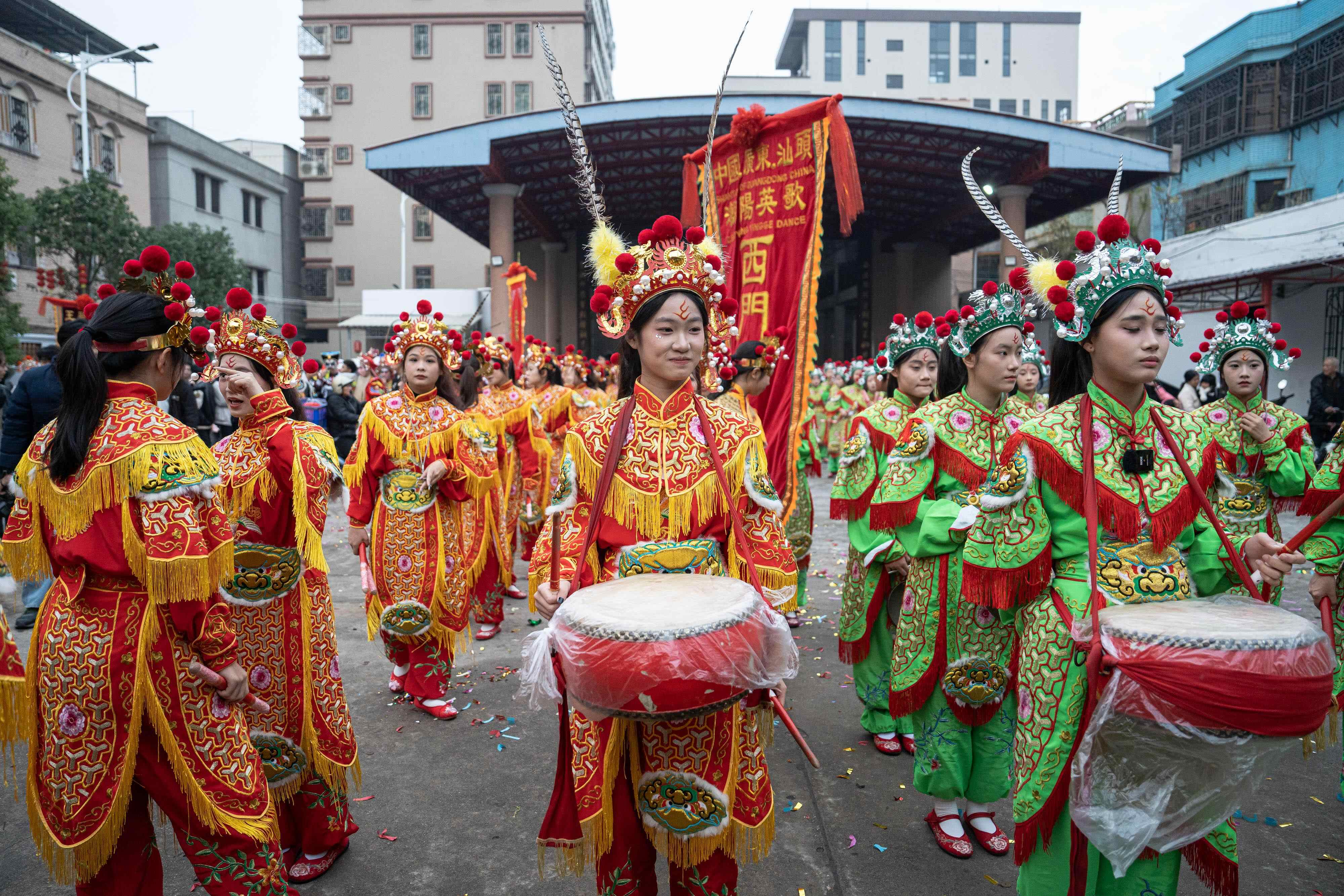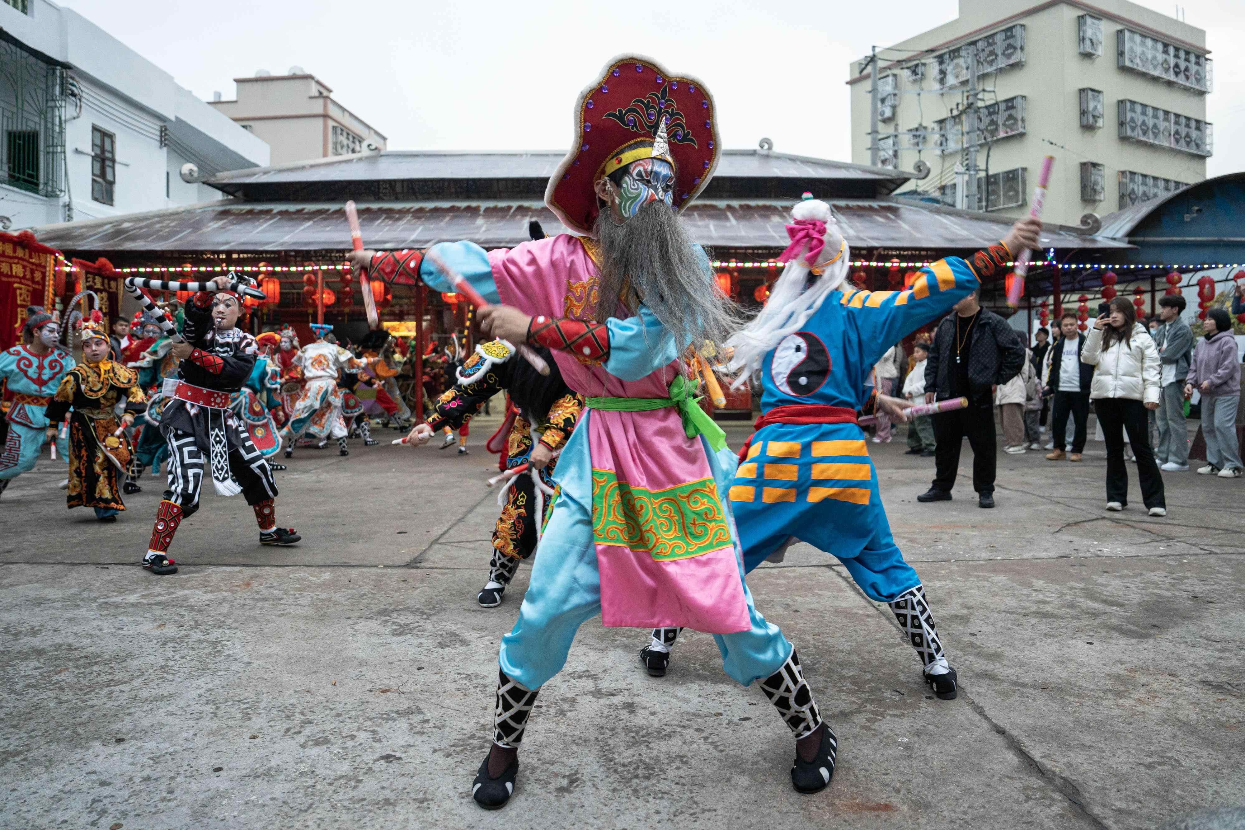 1月23日正值南方的“小年”,记者来到汕头潮阳,探班此次英歌出海的筹备现场。恰逢这支英歌队整装亮相街头进行展演,引来大批市民游客围观。