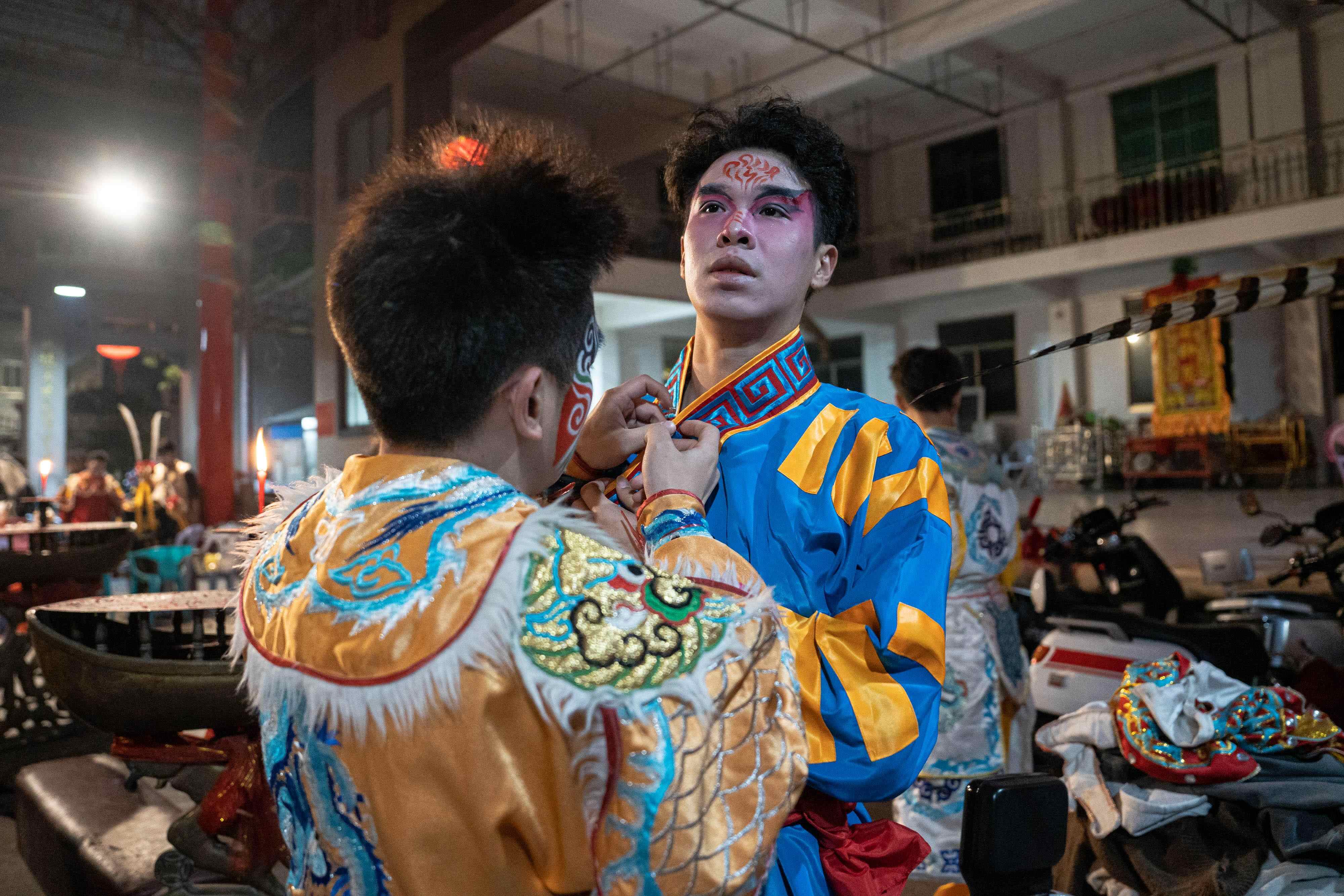 行进队伍中的英歌队员个个步伐矫健,威风堂堂,然而,这支霸气的队伍大多却是由十几岁的少年少女组成。他们会在台下相互嬉戏、玩闹,可一旦穿好戏服、画上脸谱,他们也知道,自己扮演的是英雄人物,是民间信仰的一部分,眼神中的坚定与自信不禁流露,跳动的舞步也更加卖力。