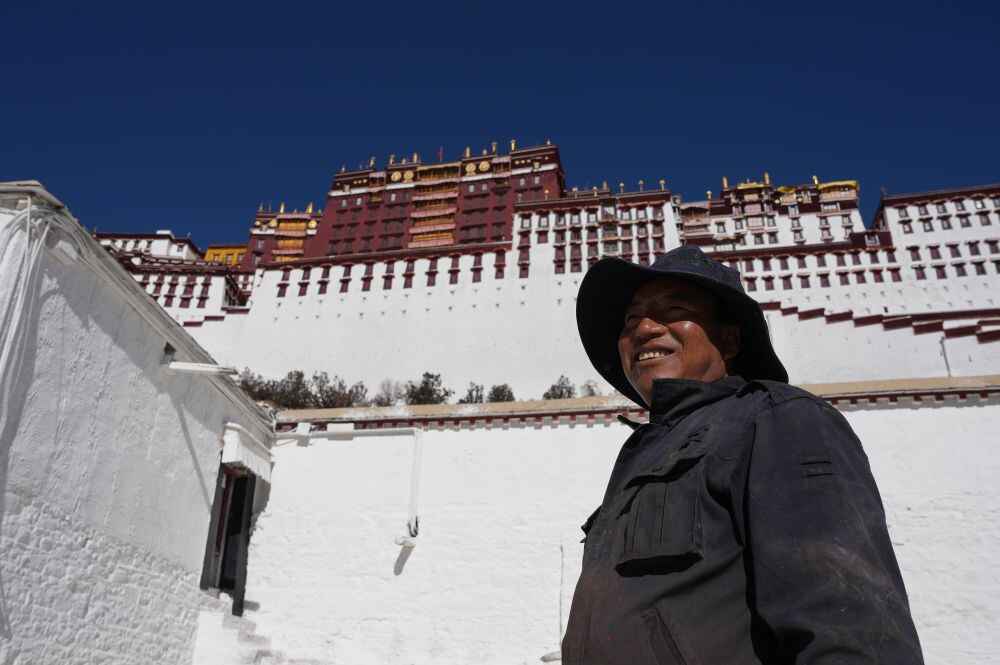维修科工匠扎西在布达拉宫前。新华社记者 晋美多吉 摄