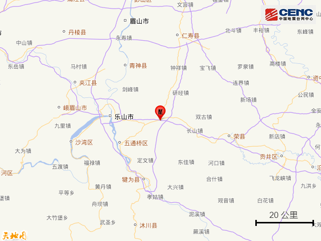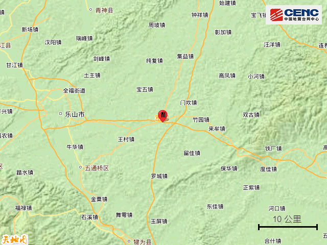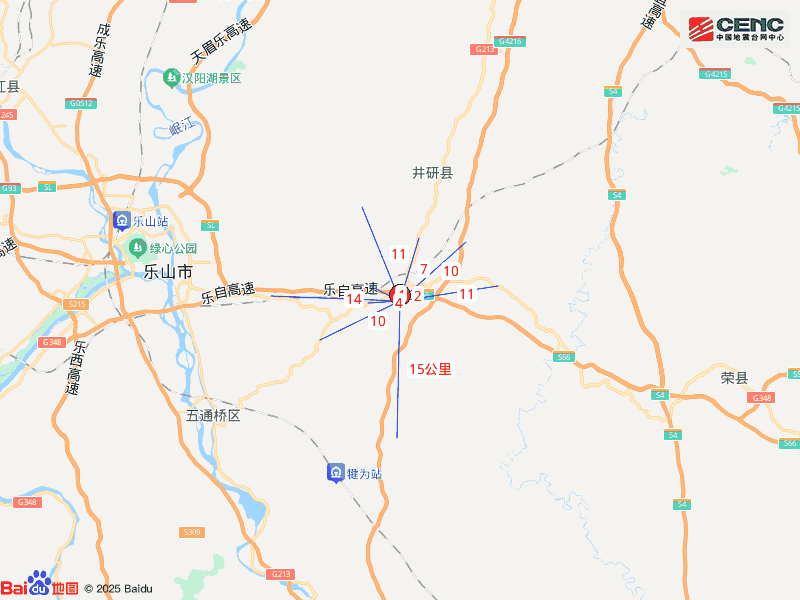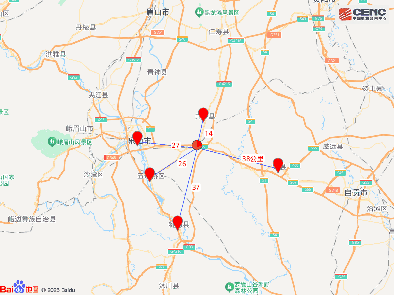 周边县城:震中距井研县14公里、距五通桥区26公里、距市中区27公里、距犍为县37公里、距荣县38公里,距乐山市27公里,距成都市125公里。