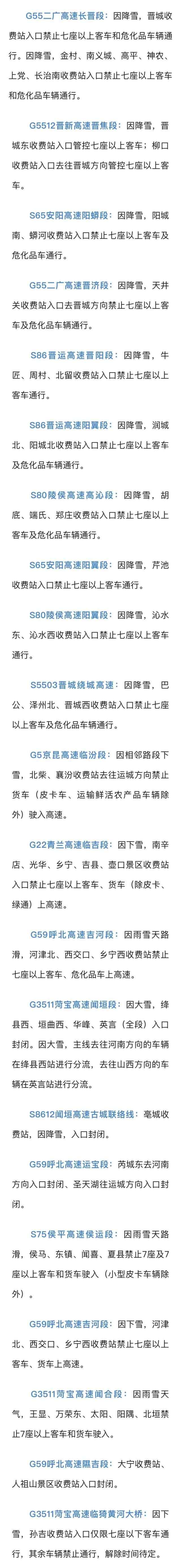 另据@河南高速公安 消息,因雨雪雾,郑州市、洛阳市、平顶山市、三门峡市域部分路段禁止所有车辆上站;因雨雪雾,开封市、平顶山市、周口市域部分路段禁止危险品运输车辆上站;因雨雪雾,开封市、许昌市、三门峡市域部分路段禁止九座(含九座)以上客车及危险品运输车辆上站;因雨雪雾,郑州市、洛阳市、许昌市、驻马店市、济源市域部分路段禁止七座(含七座)以上客车及危险品运输车辆上站;因事故,平顶山市域部分路段禁止车辆上站。其他高速公路正常通行。