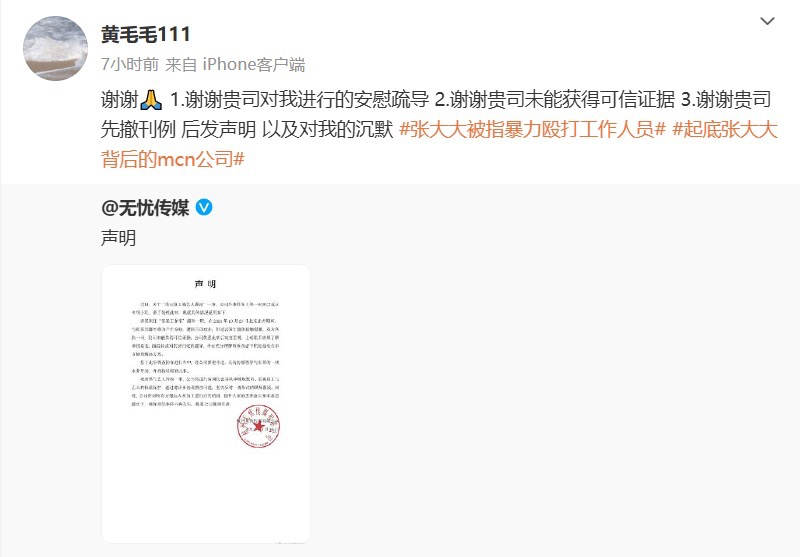 对于@黄毛毛111 所说的遭到无忧传媒工作人员威胁问题,该声明只表示“而后持续对其进行安慰疏导”。