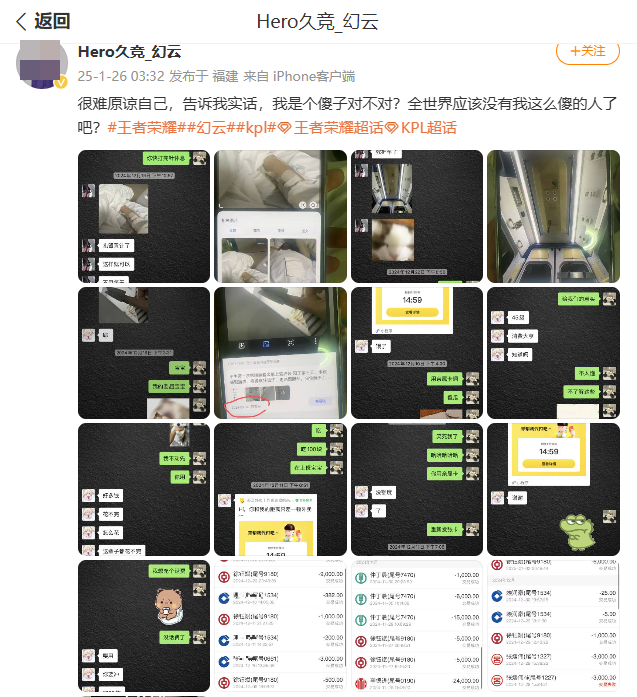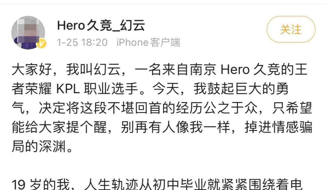 1月25日下午6点过,来自南京Hero久竞俱乐部的王者荣耀KPL职业选手幻云发文称自己掉进了情感骗局的深渊,并流露出轻生念头,引发关注。