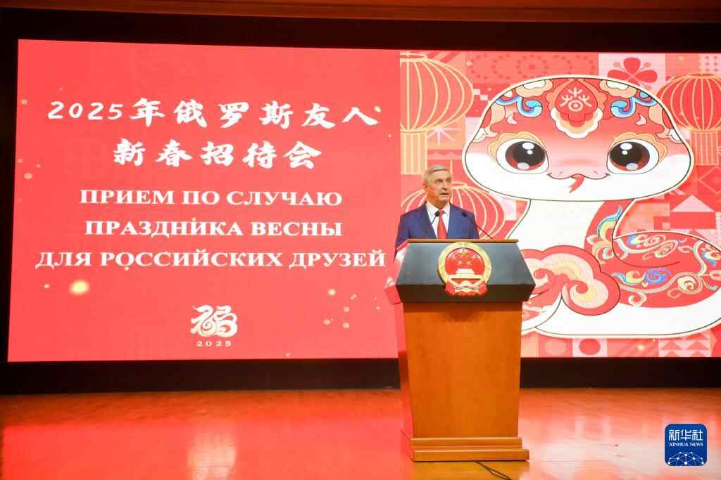 中国驻俄罗斯大使馆举办2025年俄罗斯友人新春招待会。俄罗斯国家杜马第一副主席、俄中友好协会主席梅利尼科夫在致辞中说,2024年,俄中政治合作取得新成就,经贸合作继续发展,人文合作愈加巩固。他希望在即将到来的蛇年里俄中两国人士尽其所能,让俄中关系绽放出新光彩。