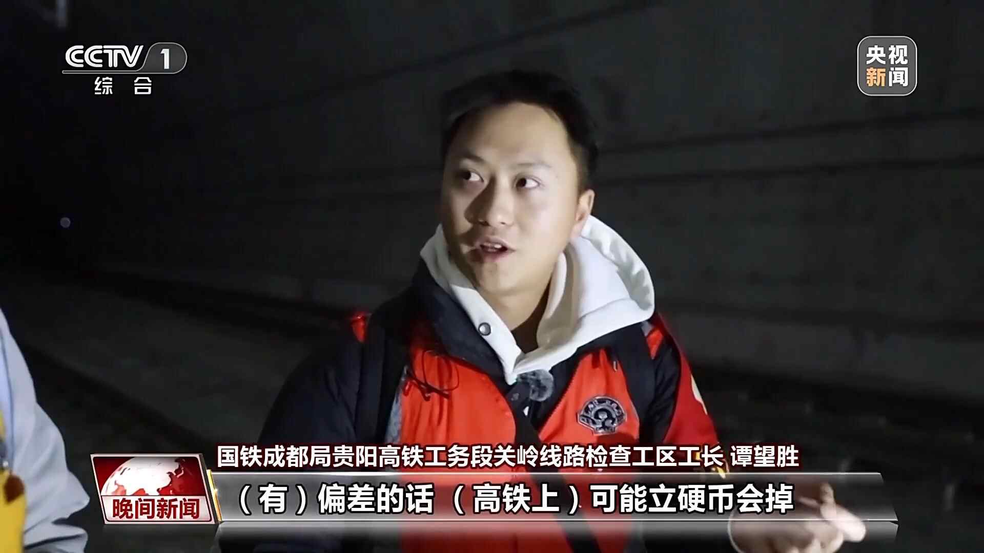 国铁成都局贵阳高铁工务段关岭线路检查工区工长 谭望胜:主要目的就是保持线路的一个平顺度,提高旅客坐车的舒适度,有偏差的话,高铁上可能立硬币会掉,水杯会晃。