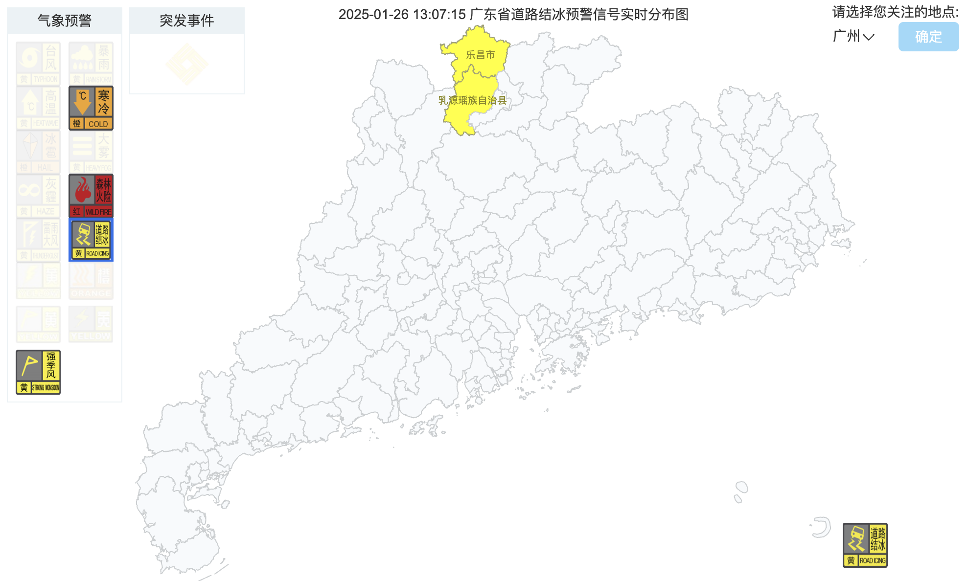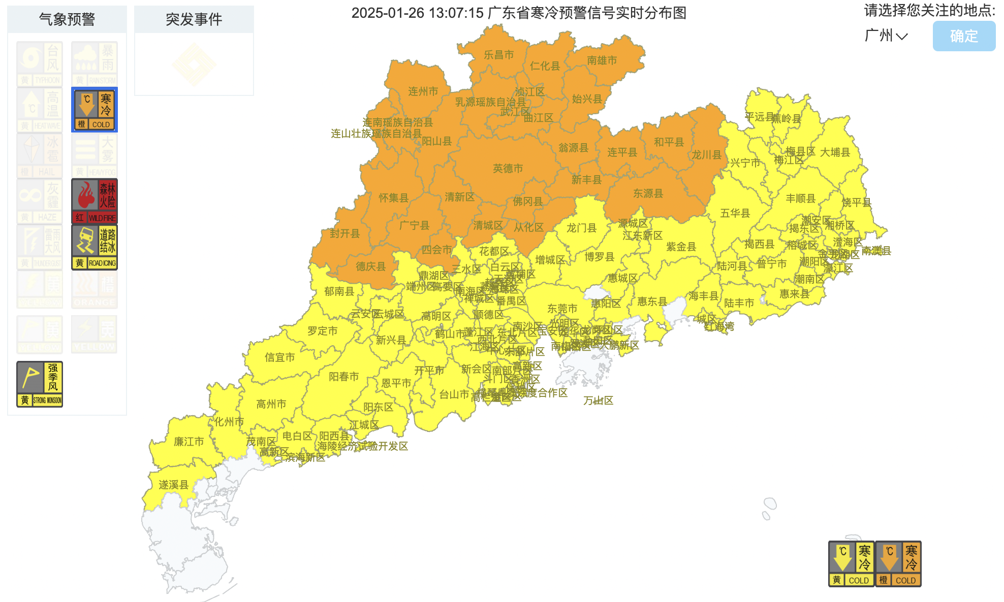 在强冷空气影响下,截至1月26日中午,广东多个预警信号生效。其中清远、韶关全市均已发布寒冷橙色预警信号,肇庆、云浮、河源、广州部分市县区发布寒冷橙色预警信号;乐昌、乳源两地发布道路结冰黄色预警信号。