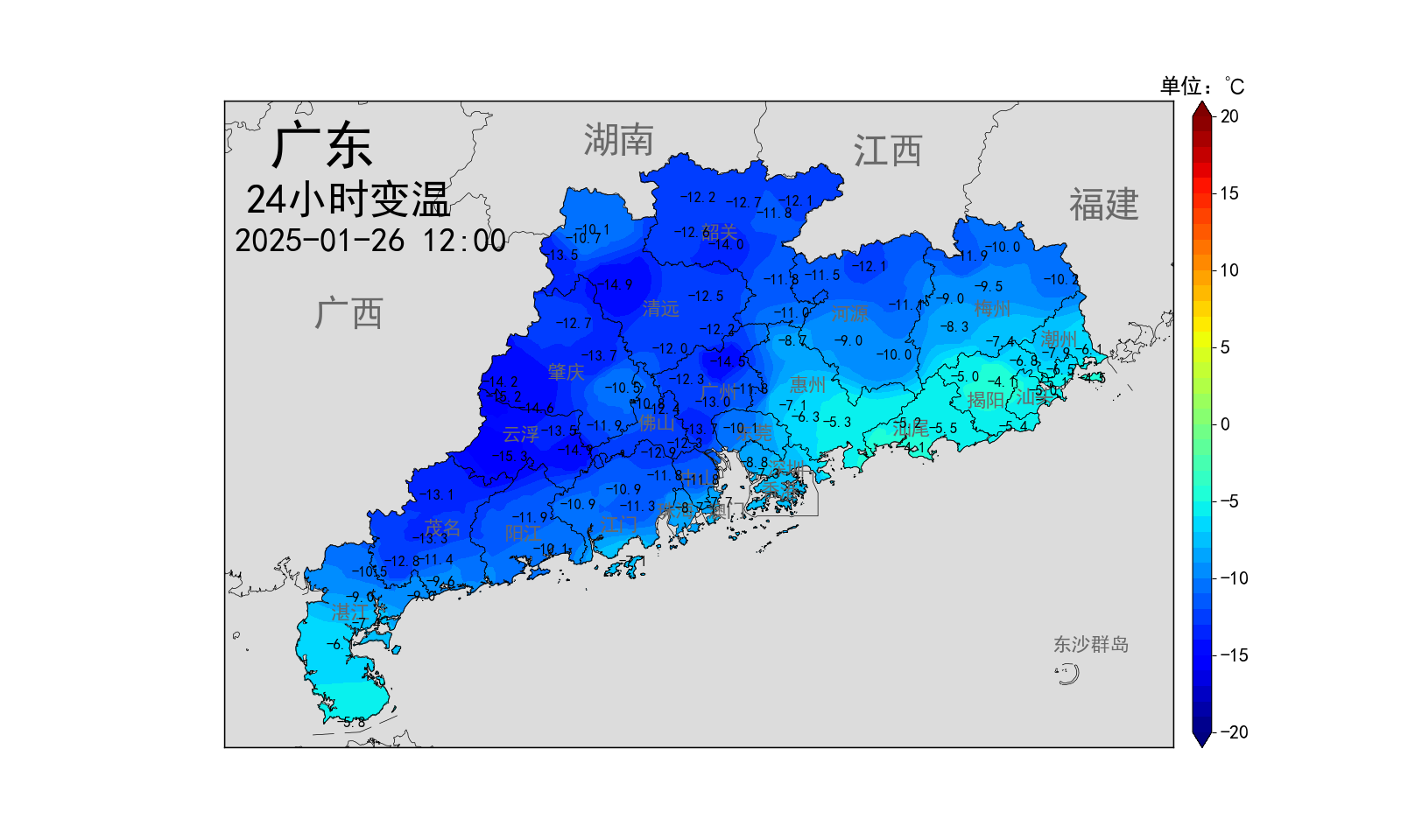 根据广东省气象部门监测,受强冷空气影响,25日夜间起广东中西部市县地区出现了小雨,其中肇庆、云浮出现了中雨,中西部市县气温大幅下降,26日8时气温较25日同期下降了5~9℃;截至26日12时,粤北、粤西北、珠三角中北部多个市县气温同比24小时前下降超过10℃。