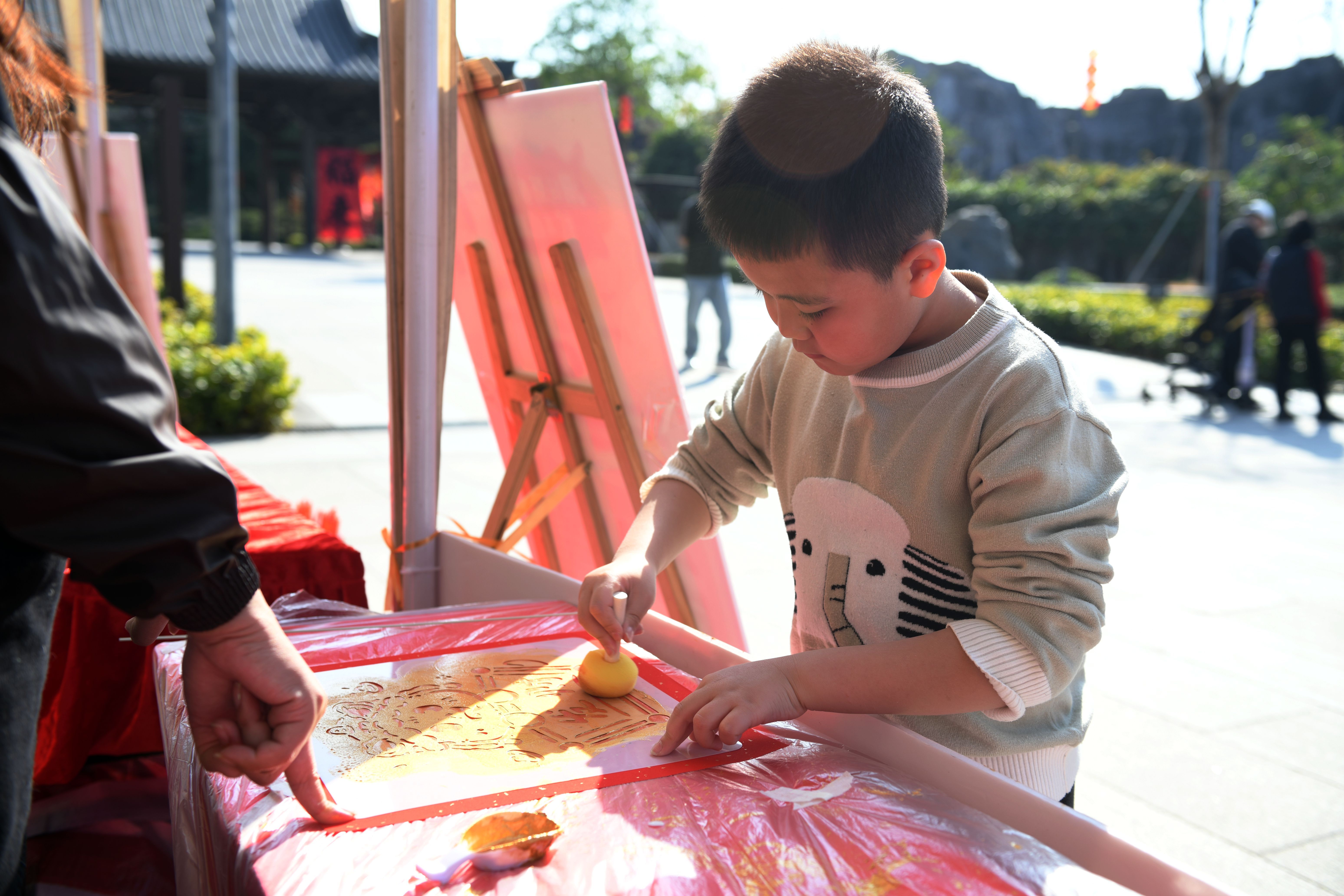 30多位书法志愿者现场挥毫,将新春祝福送给市民朋友。活动现场还设置了互动体验集市,邀请大家体验制作棉花糖、绘制醒狮、DIY漆扇、拓印福字等各种趣味活动。