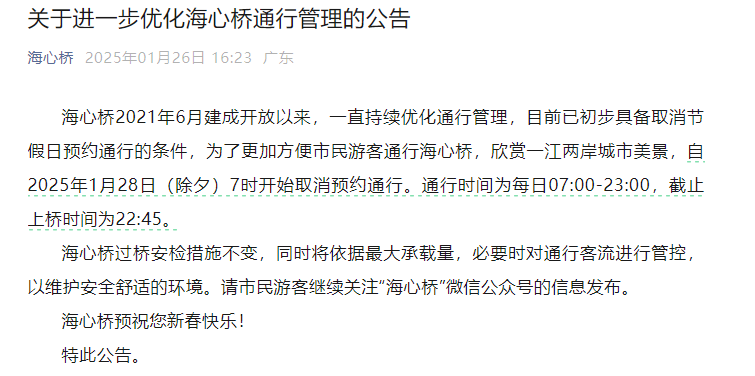 海心桥2021年6月建成开放以来,一直持续优化通行管理,目前已初步具备取消节假日预约通行的条件,为了更加方便市民游客通行海心桥,欣赏一江两岸城市美景,自2025年1月28日(除夕)7时开始取消预约通行。通行时间为每日07:00-23:00,截止上桥时间为22:45。