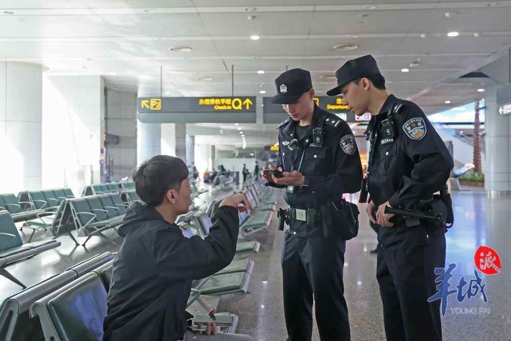 早上9点,广东省公安厅机场公安局白云机场一号航站区派出所“95后”民警陈臻、刘剑锋穿戴好装备,开始了持续24小时的值班日。