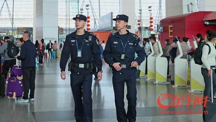 早上9点,广东省公安厅机场公安局白云机场一号航站区派出所“95后”民警陈臻、刘剑锋穿戴好装备,开始了持续24小时的值班日。