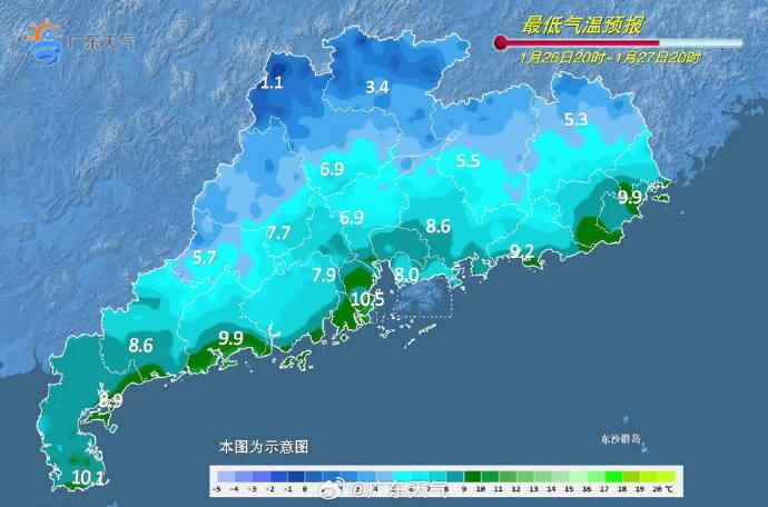 预计1月27日-29日,广东大部以多云到晴天气为主,天气寒冷,中北部市县最低气温2~5℃,高海拔山区零下3℃~0℃,有冰冻或霜冻。