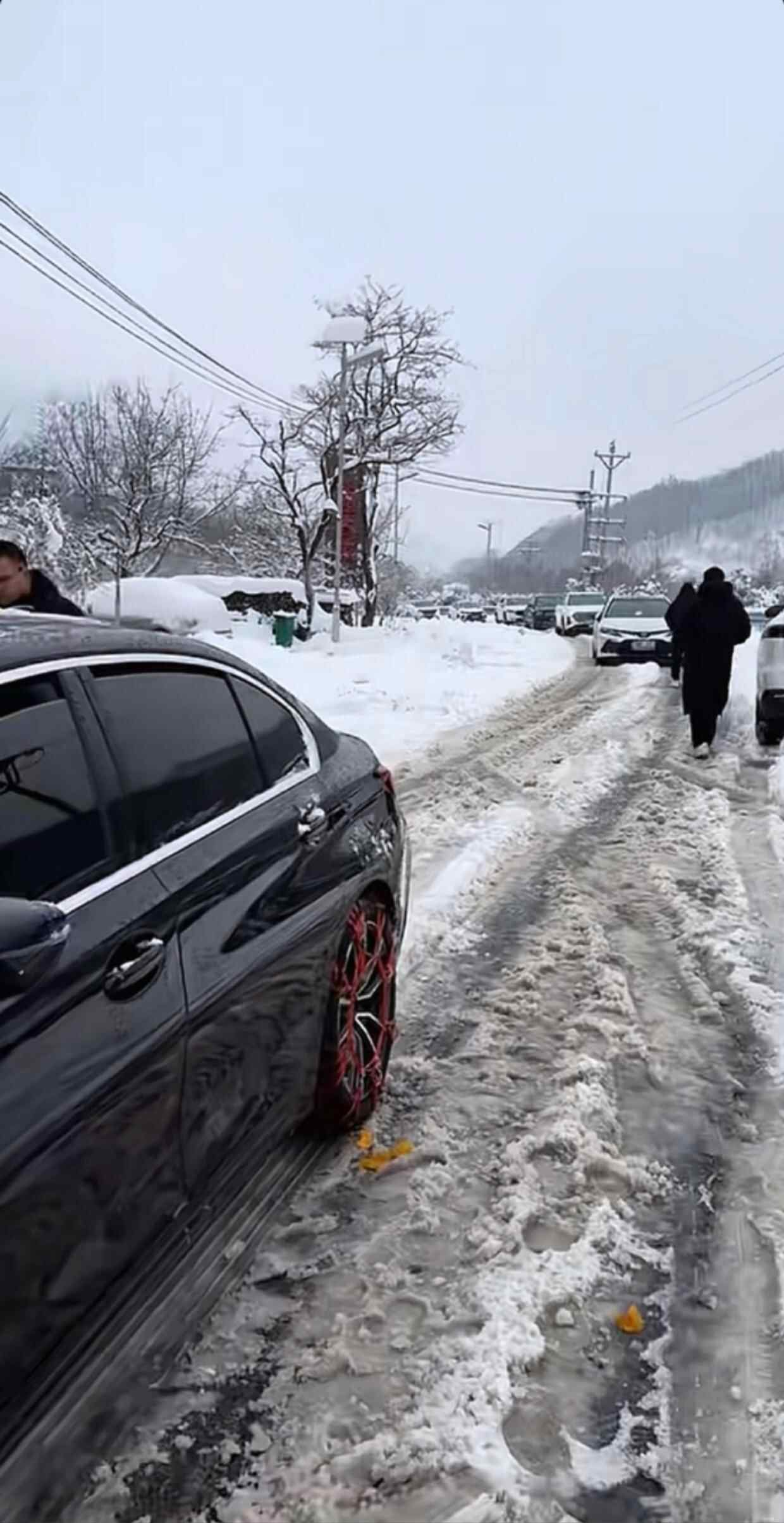 这时积雪已经开始融化,路面水雪交融,一辆救护车往我们回家的方向开去,我下车问了路上疏导交通的工作人员,问能否跟着救护车先去服务区里待上一晚,也能顺便给车充电,那时路上不管是快车道还是慢车道,全是大货车堵着。最后我们得到了允许,就这样安全地到了服务区。