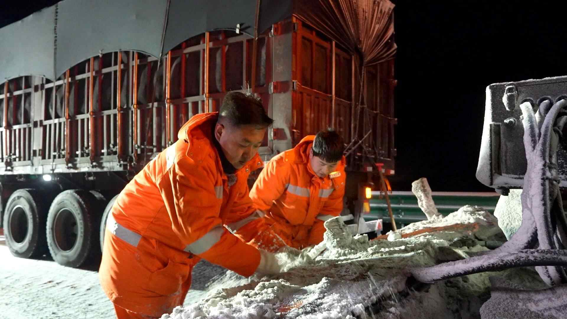 当除雪滚刷被冰雪塞满,公路人着急地徒手清理起来。