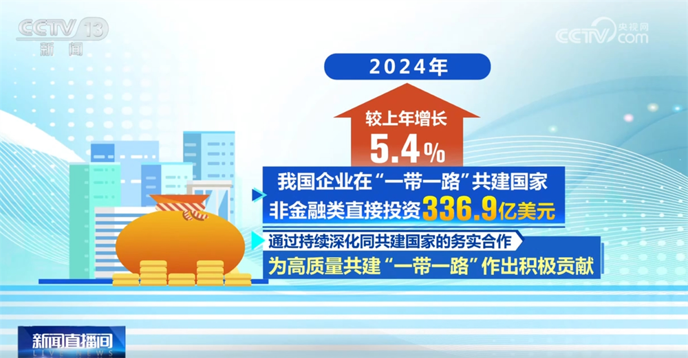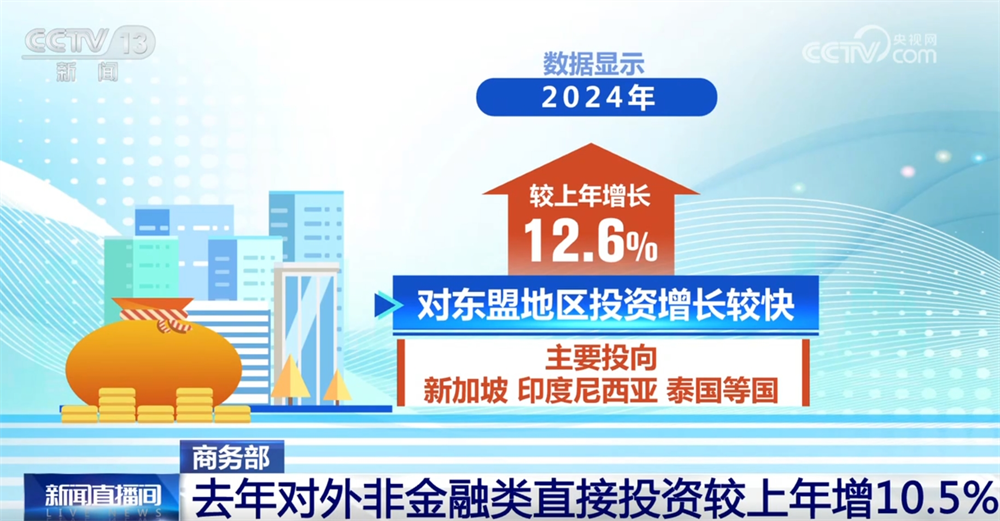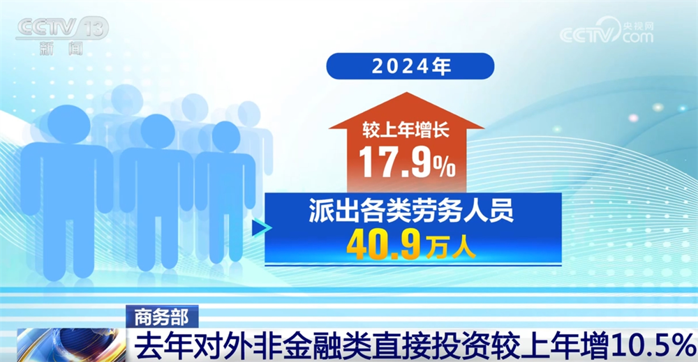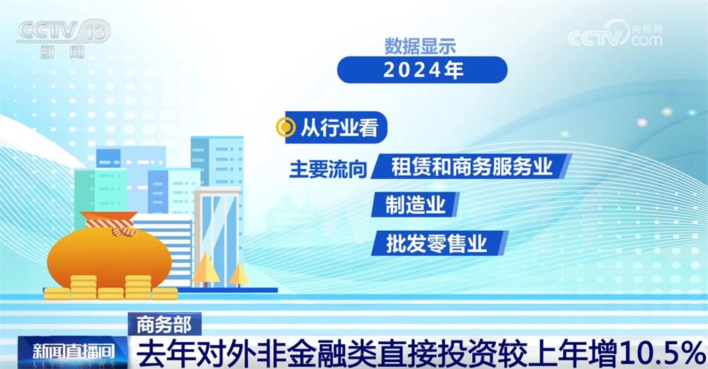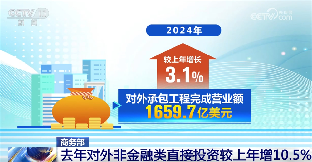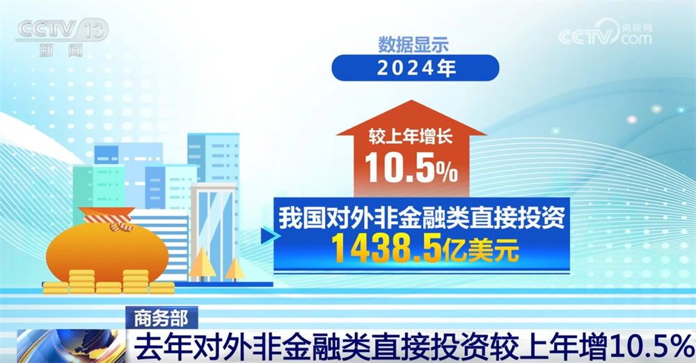 央视网消息:商务部最新发布的数据显示,2024年,我国对外投资合作实现平稳发展,对外非金融类直接投资较上年增长10.5%。
