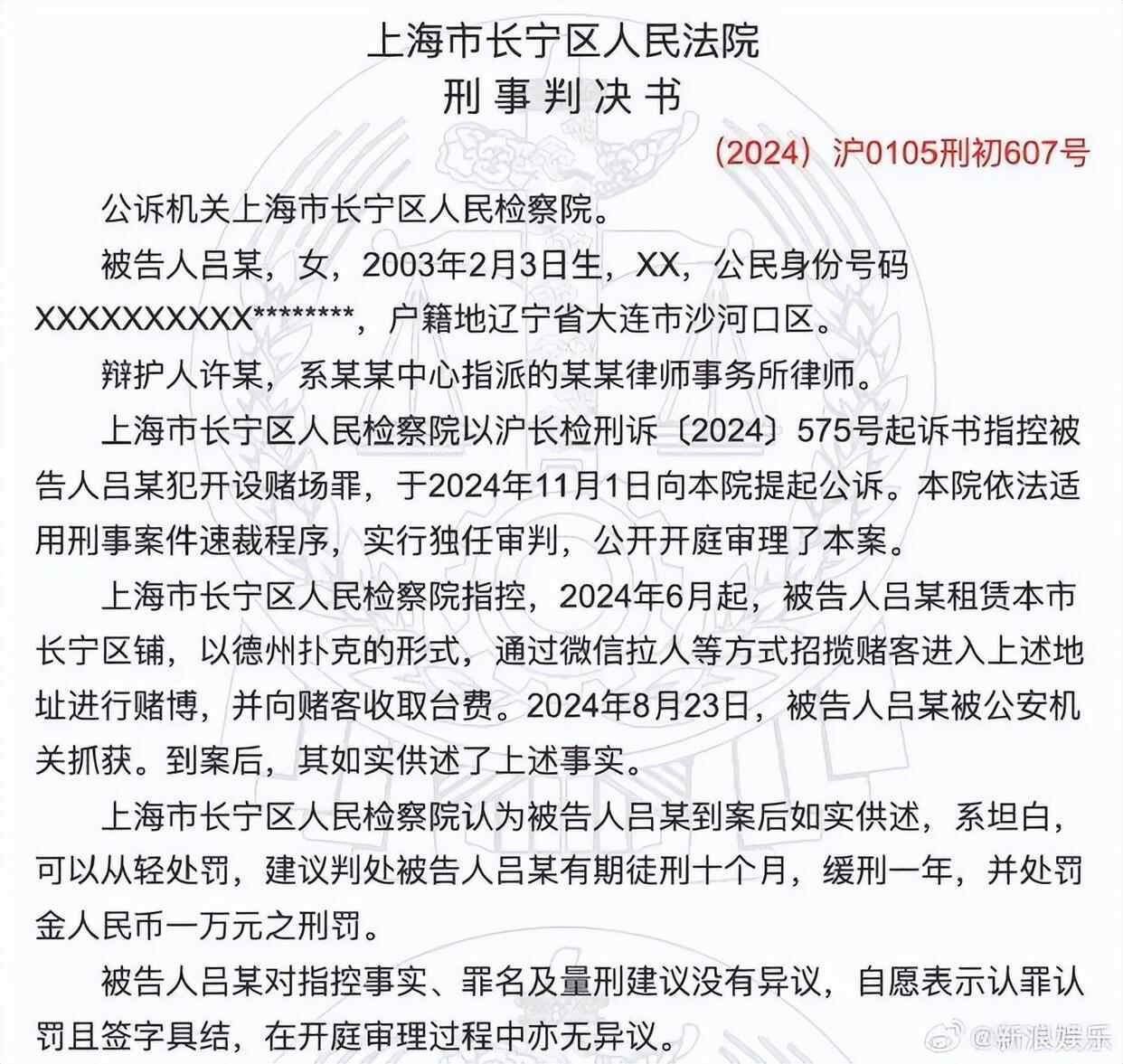 据中国裁判文书网,前SNH48成员吕相宜犯开设赌场罪获刑十个月,缓刑一年,并处罚金人民币一万元。