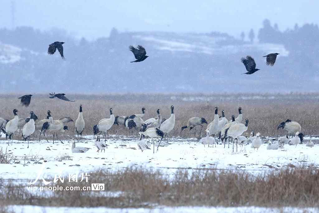 2025年1月26日,贵州省毕节市威宁自治县草海国家级自然保护区郑家营夜栖地,在银装素裹的雪地上,一群黑颈鹤悠然自得地觅食。