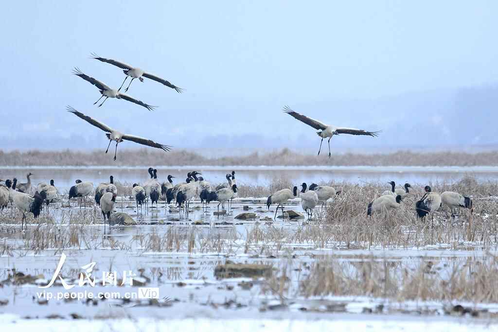 草海国家级自然保护区,作为中国著名的高原淡水湖泊和世界濒危动物黑颈鹤的最大越冬地之一,被誉为“中国黑颈鹤之乡”和“鸟的天堂”。每年冬季,超过10万只候鸟飞抵这里越冬,其中黑颈鹤更是保护区内的明星物种。沈光勇摄(人民图片网)
