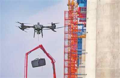 杭州湾跨海铁路大桥施工现场,无人机正在运送工程物资。