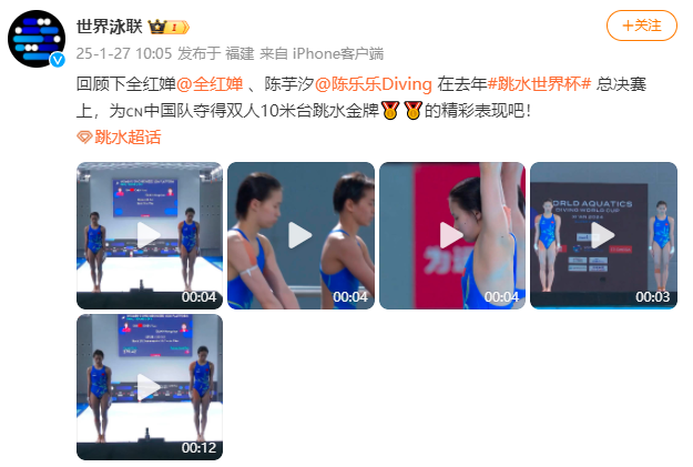 同日,世界泳联官方账号晒出全红婵和陈芋汐2024年超级总决赛的完美五跳。