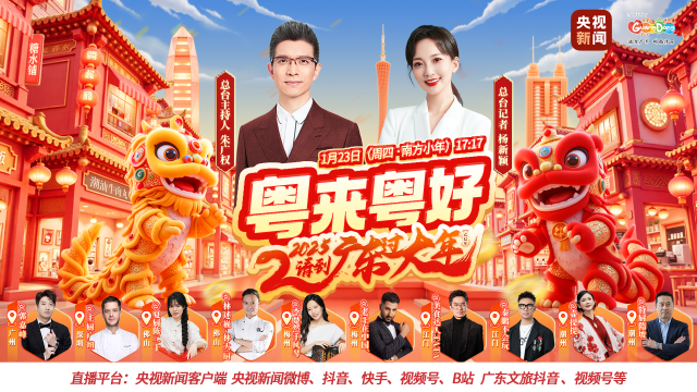 1月23日,南方小年夜,由朱广权主持,十位网络达人在直播中带领网友们逛吃广州、深圳、佛山、江门、梅州、韶关、潮州等地,在经典和全新的文旅体验中,品味年味,实时观看人数达数百万。