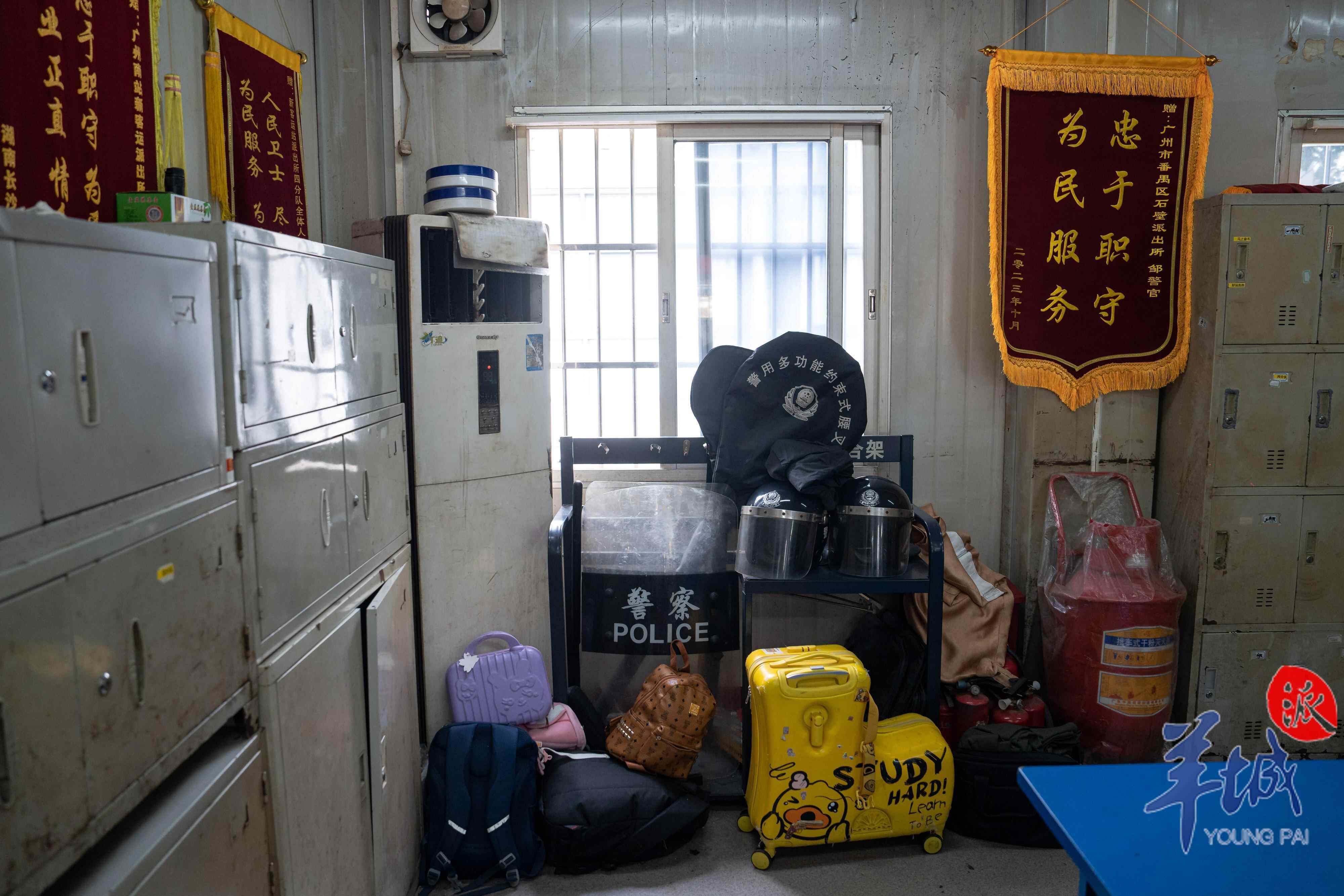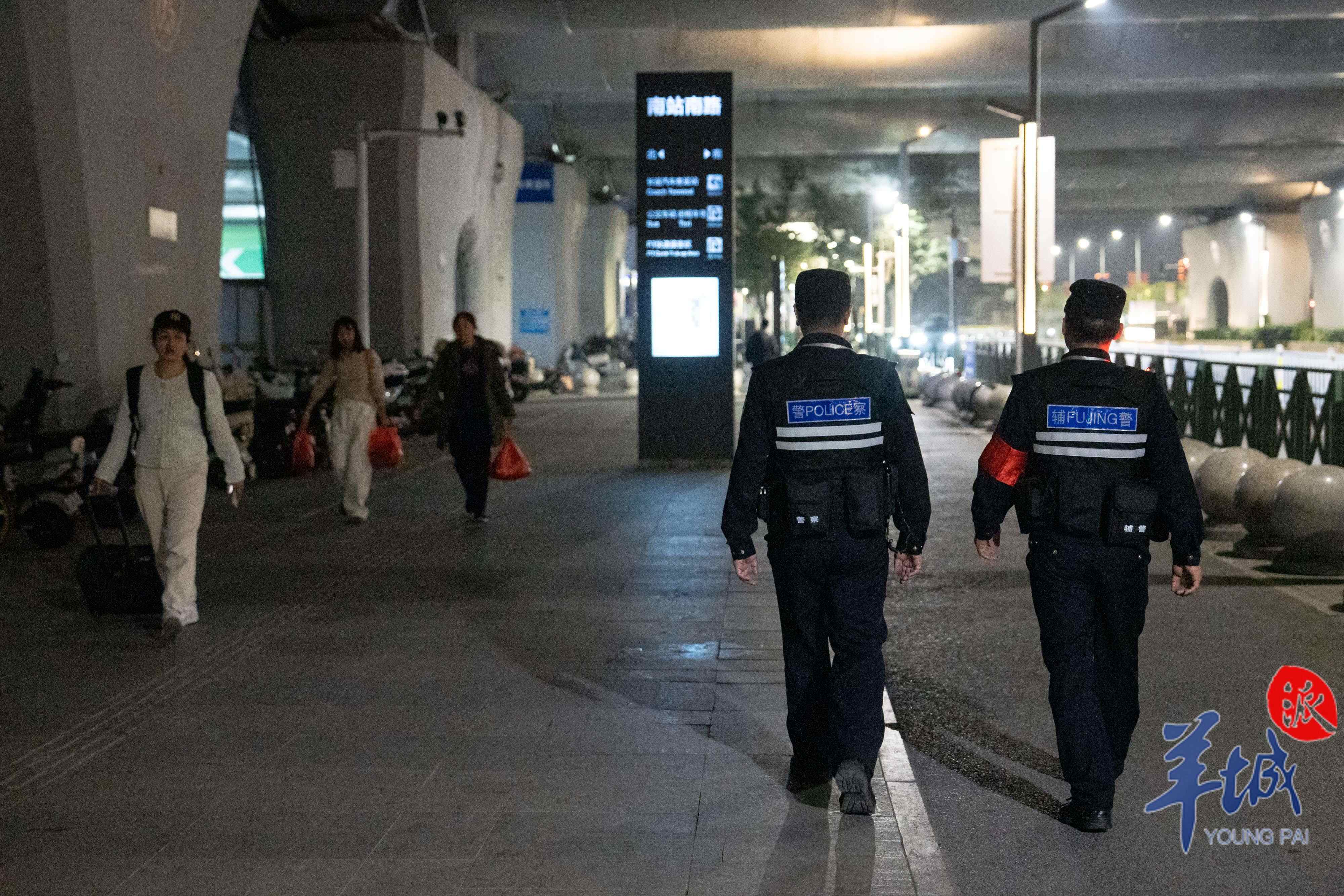 傍晚,夜幕降临,广州南站西广场警务室门口的警灯亮起。红蓝灯光,交替闪烁,成为广场上最显眼的存在。