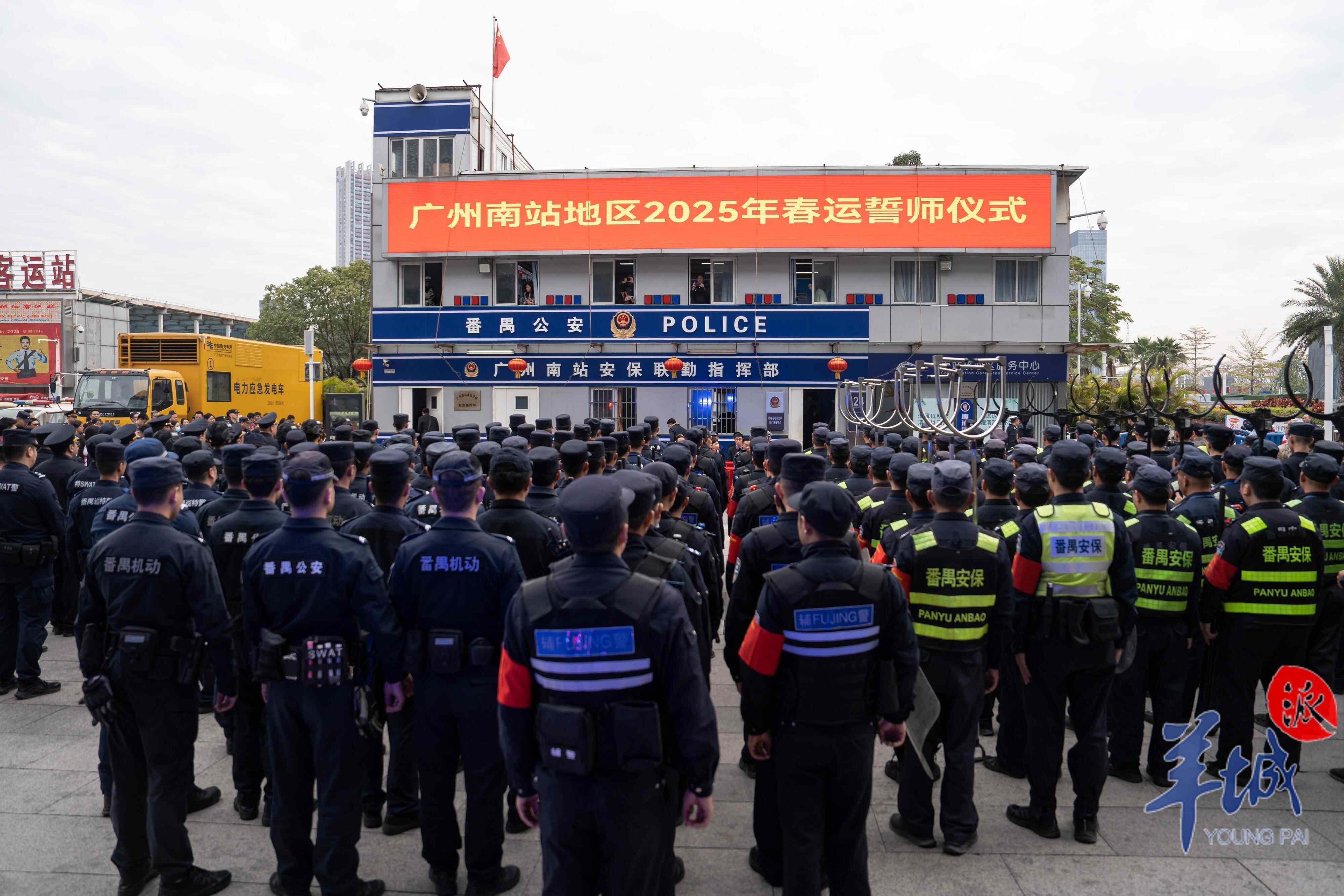 “一、二、三、四!”1月14日上午,春运首日,广州南站东广场传来整齐且有力的口号声。当天,广州南站地区的公安、交通、卫健等单位的400余人集结,举行2025年春运誓师仪式,郑重承诺保障旅客平安顺畅出行。