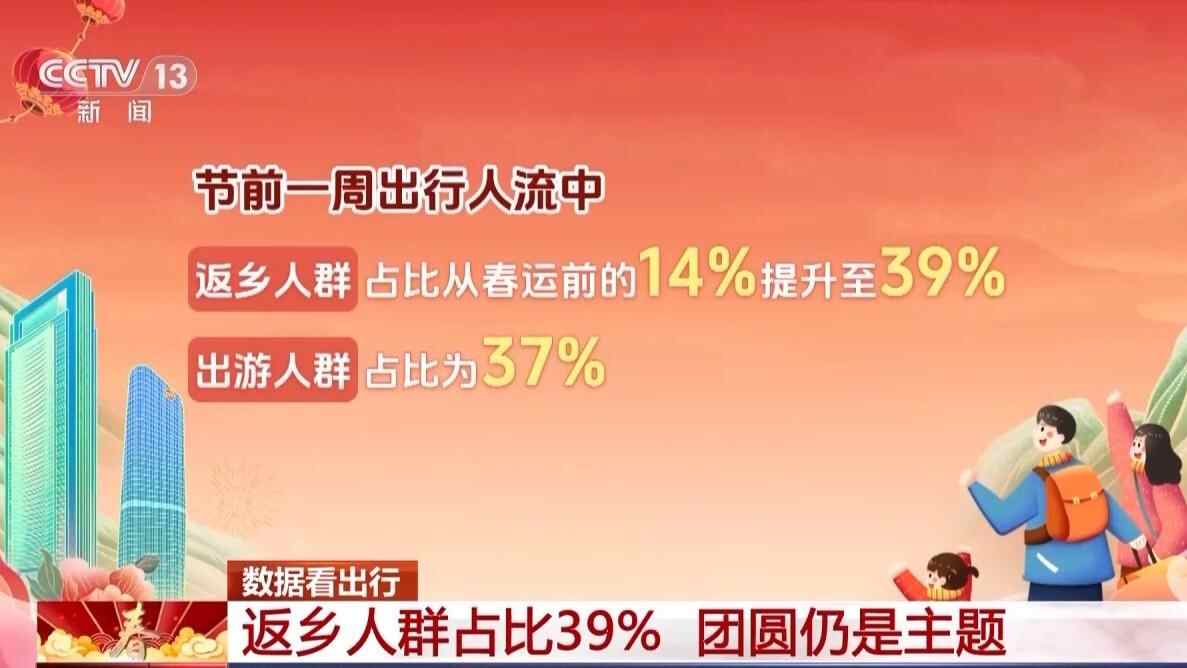 中国移动梧桐大数据分析发现,节前一周,返乡人群占比从春运前的14%大幅跃升至39%,出游人群占比达37%,可见返乡团圆仍是主旋律。