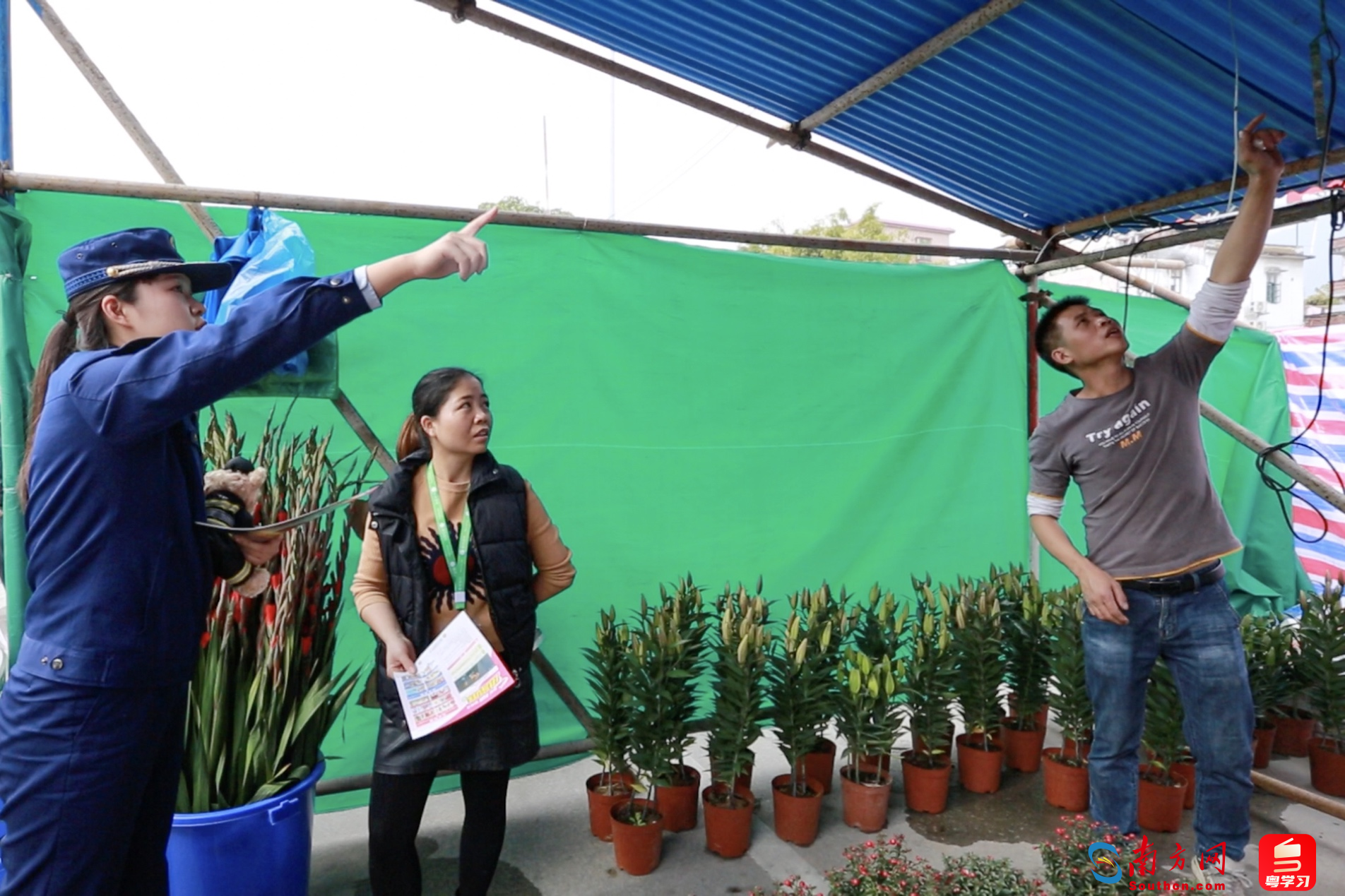 “您好,这里有一些家庭防火的宣传单可以看看,这旁边停放的电动自行车是您的吗?在这个摊位旁边就不要充电了哦。”“您看您吊着的这个电线外面的保护层已经破掉,里面的电线已经裸露,要换一下,不然很危险。”盘嘉静和宣传服务队的小伙伴正在花街里,逐一为摊主派发消防科普手册,提示摊主摊位里存在的隐患,并对花市现场设置的灭火器进行查看。
