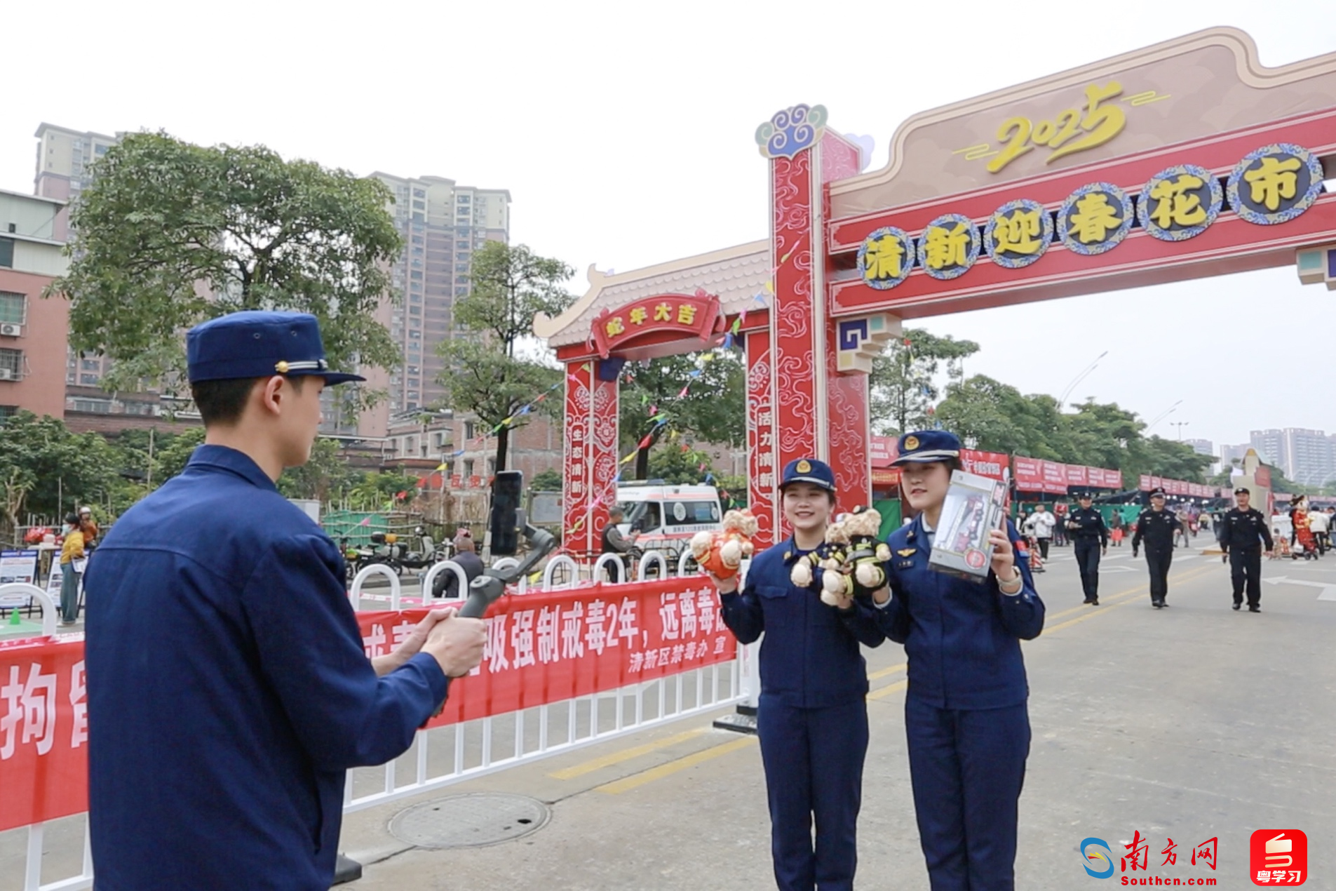 清新区消防救援大队在迎春花市现场进行消防宣传活动及现场直播
